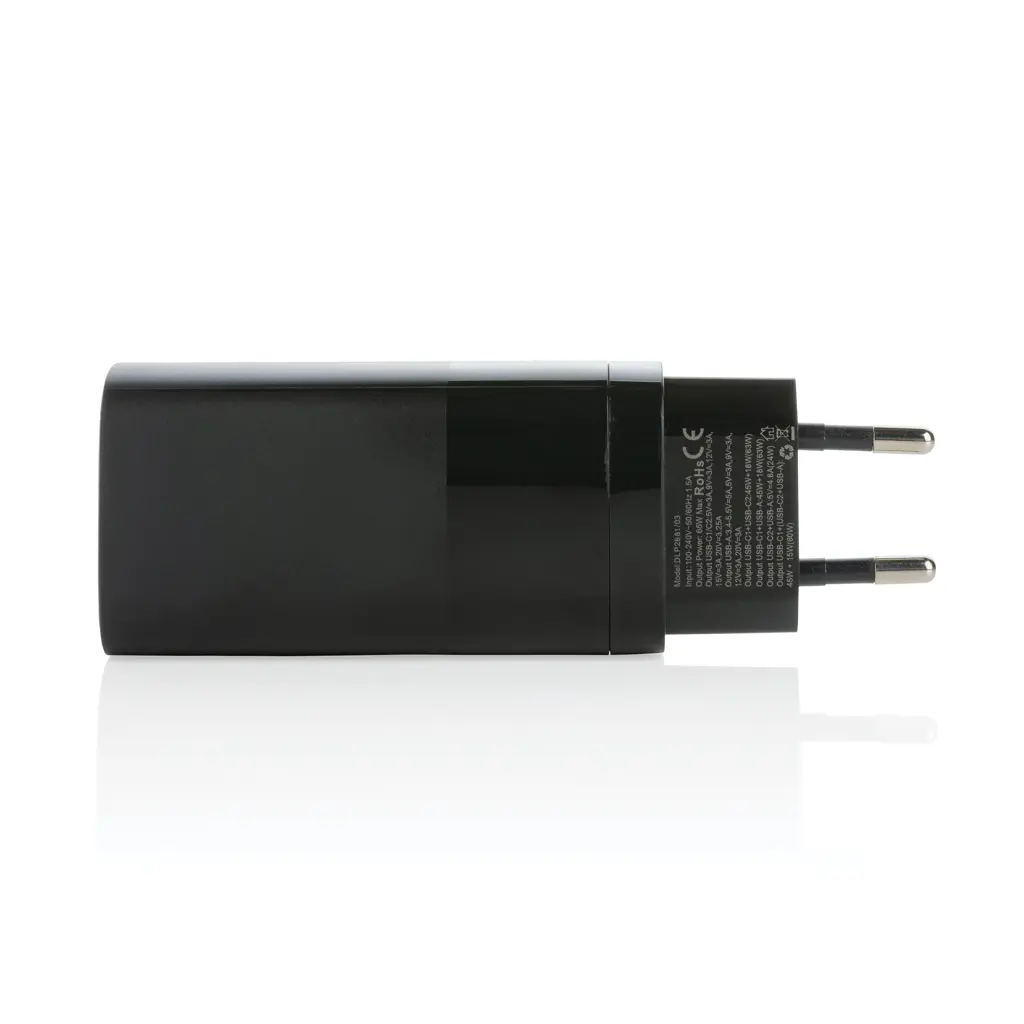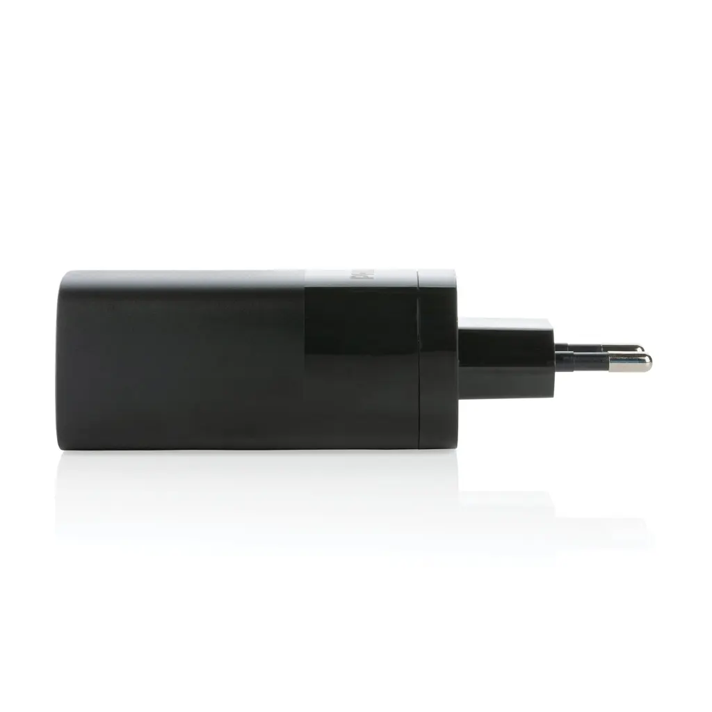 Zidni punjač 65W Ultra Fast PD s dvije Type-C izlazne priključnice i jednom USB-A priključnicom, omogućuje brzo punjenje pametnih telefona, tableta i laptopa, opremljen zaštitom od pregrijavanja, prenapona i preopterećenja, koristi GaN (galijev nitrid) tehnologiju za manju veličinu i veću učinkovitost, omogućuje punjenje do 50 % u 30 minuta
