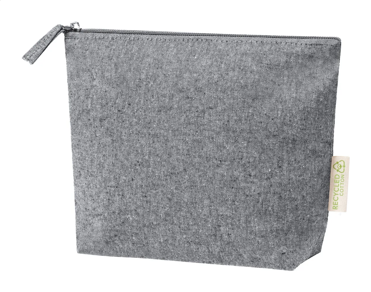 Kozmetička torbica s patentnim zatvaračem od recikliranog pamuka. S karakterističnom etiketom od recikliranog pamuka. 100% reciklirani pamuk, 180 g/m².