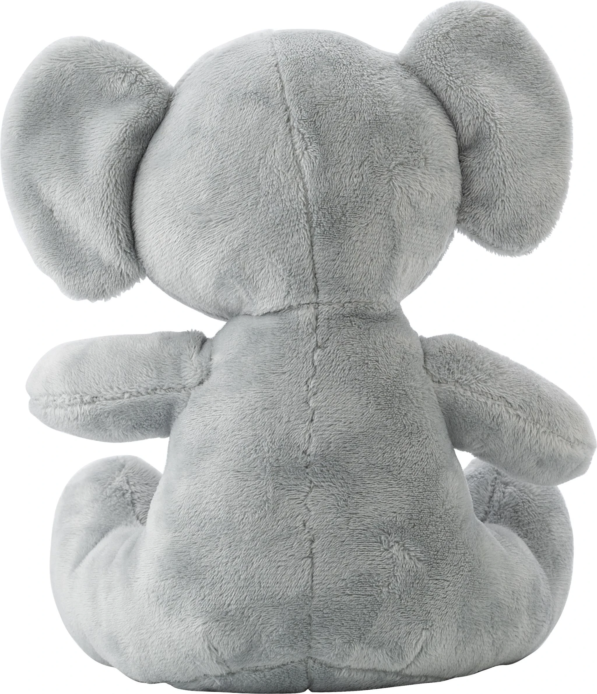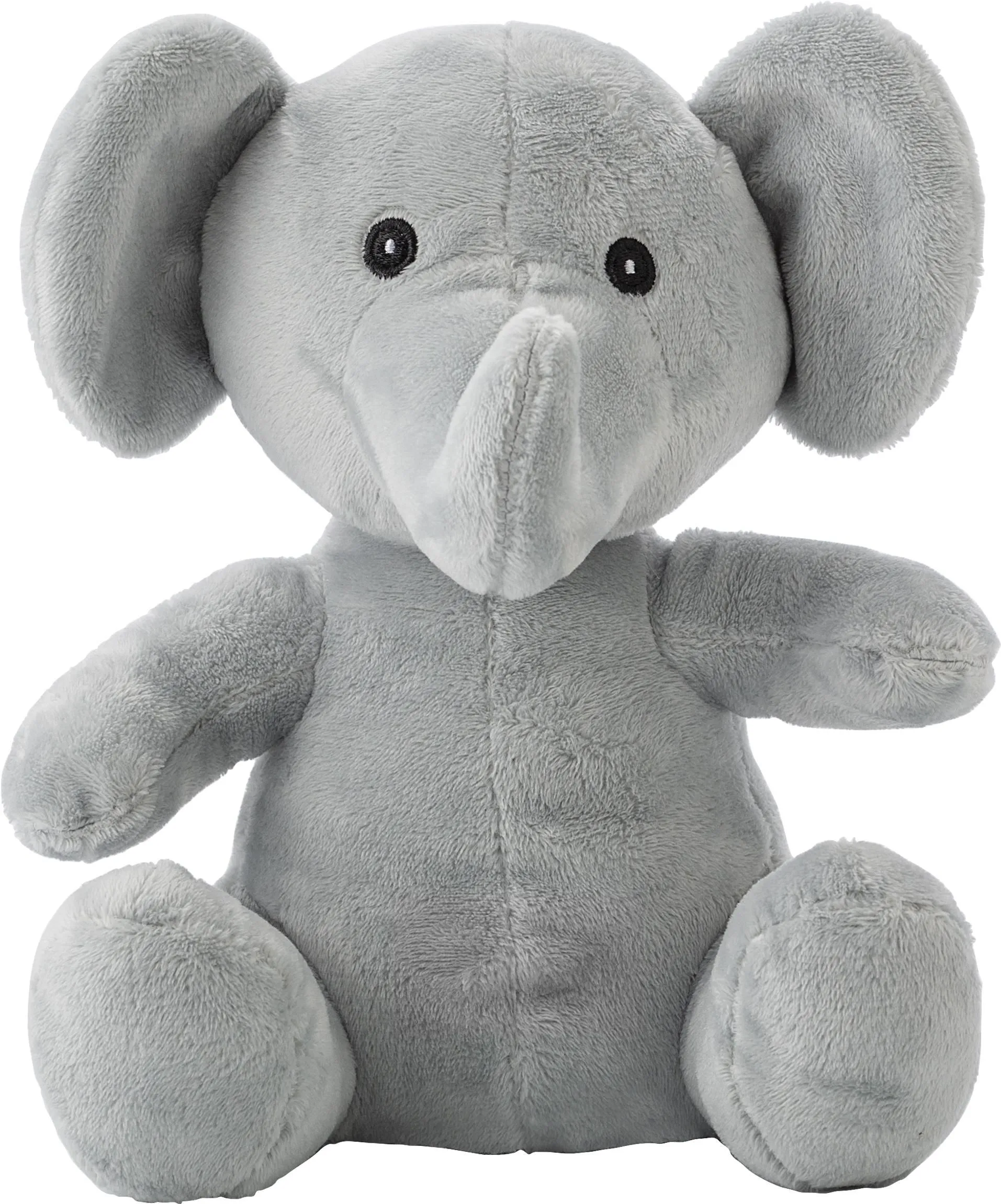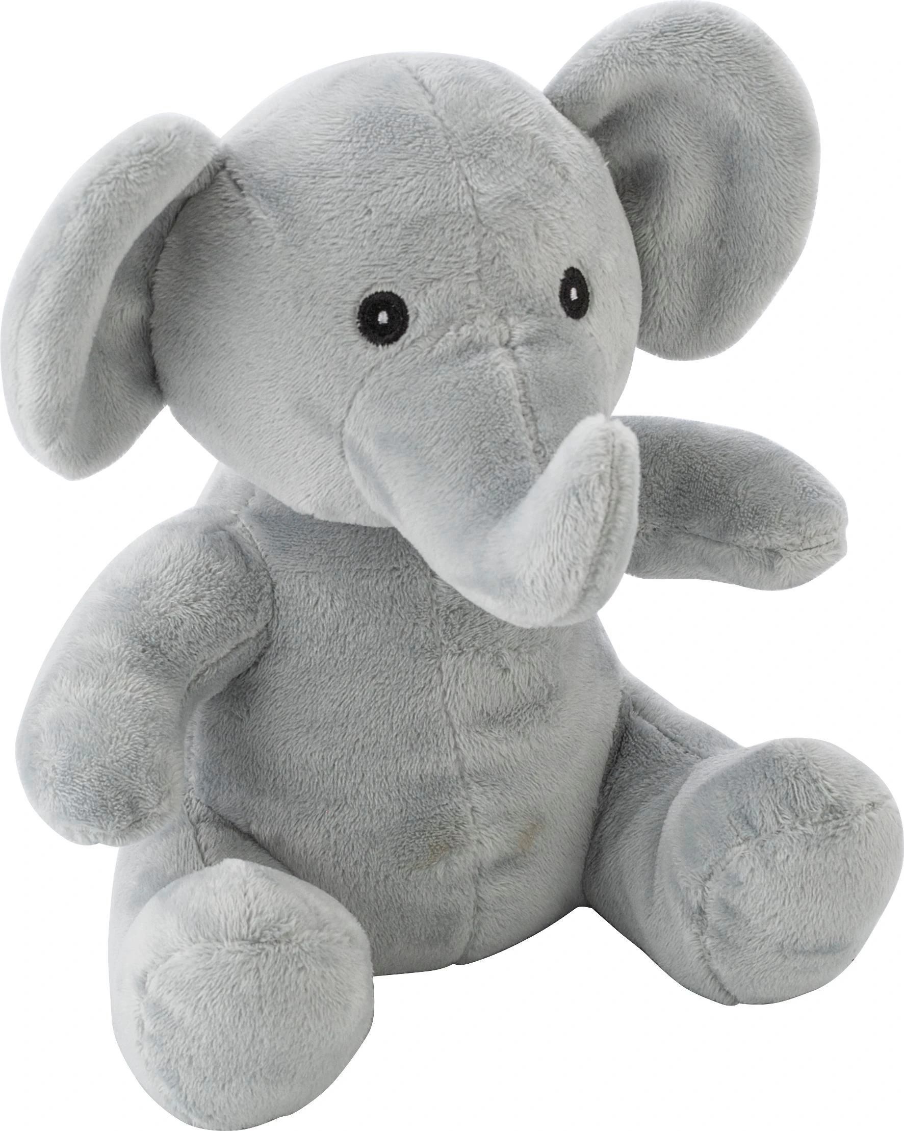 Plišani slon s izvezenim očima, nosom i ustima, s etiketom za tisak
