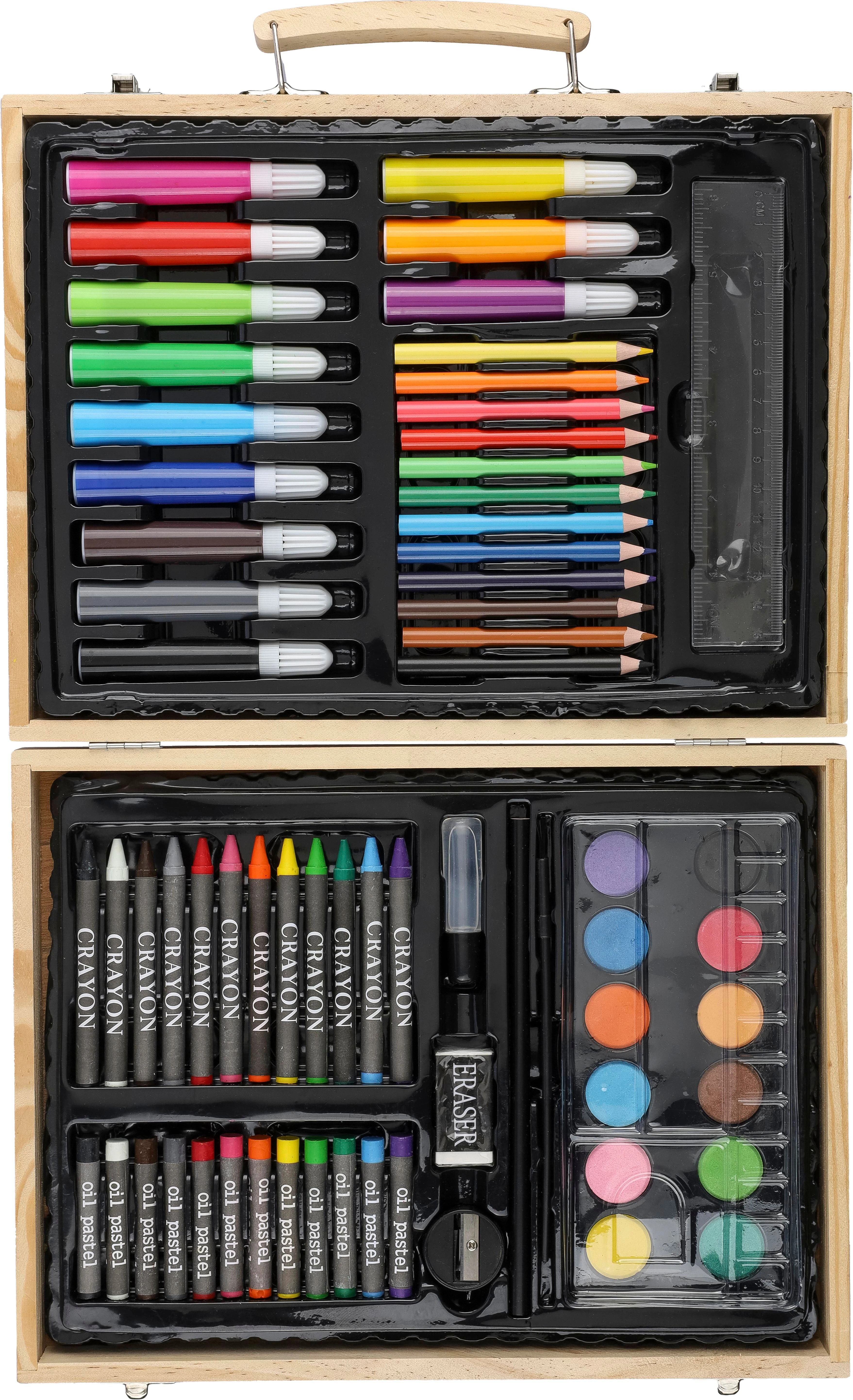 €8.66Set za crtanje od šperploče u kutiji od borovine s drvenom ručkom, sadrži 66 dijelova: 12 voštanih bojica, 12 drvenih bojica (šiljenih), 12 flomastera, 12 uljnih pastela, ljepilo u stiku, gumicu, šiljilo, ravnalo, kist, 12 boja i paletu, pojedinačno pakirano u smeđu kartonsku kutiju s dostupnom ručkom za nošenje