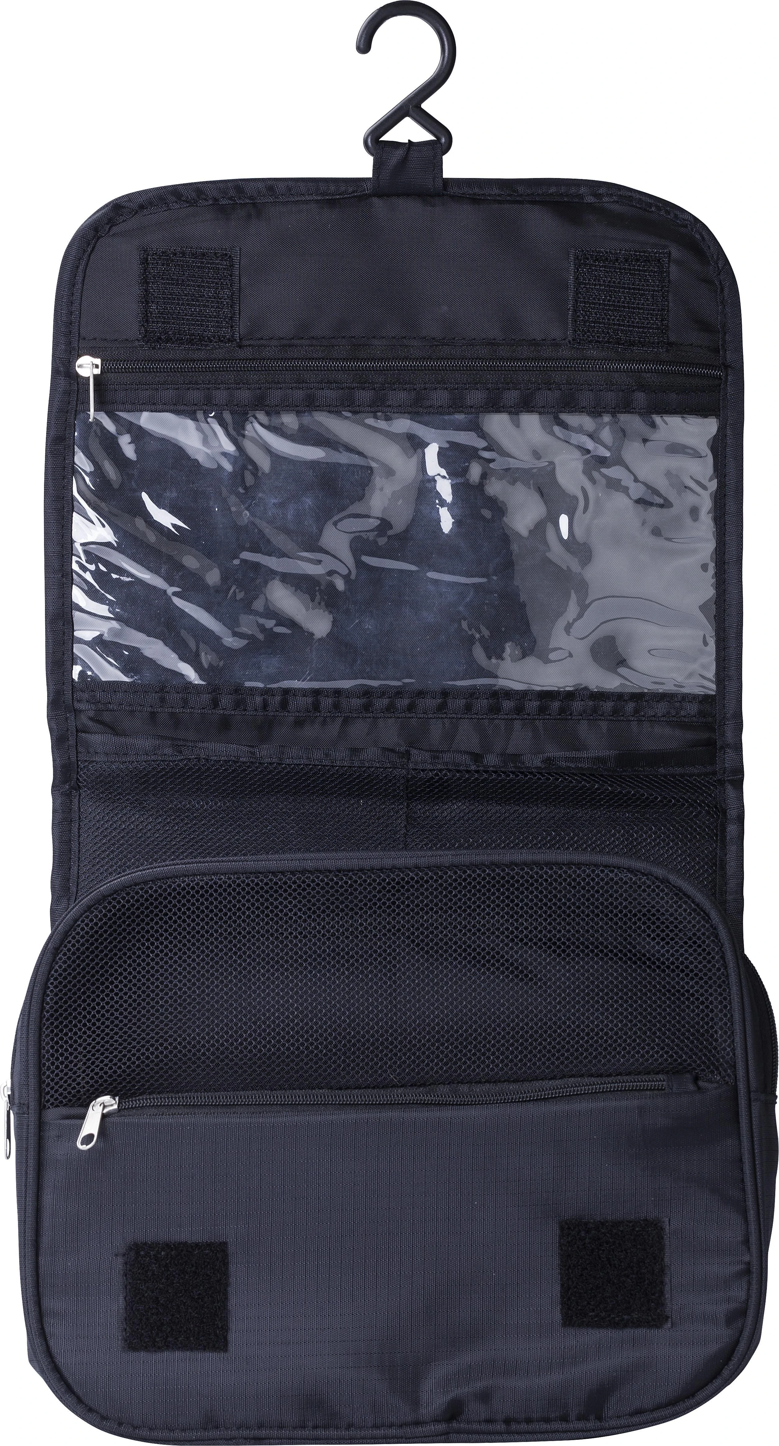Putna toaletna torbica od poliestera (210D) ripstop s kukom za vješanje, gornji džep s patentnim zatvaračem, jedan veliki i jedan mali mrežasti džep s patentnim zatvaračem, džep na stražnjoj strani, kratka ručka za nošenje