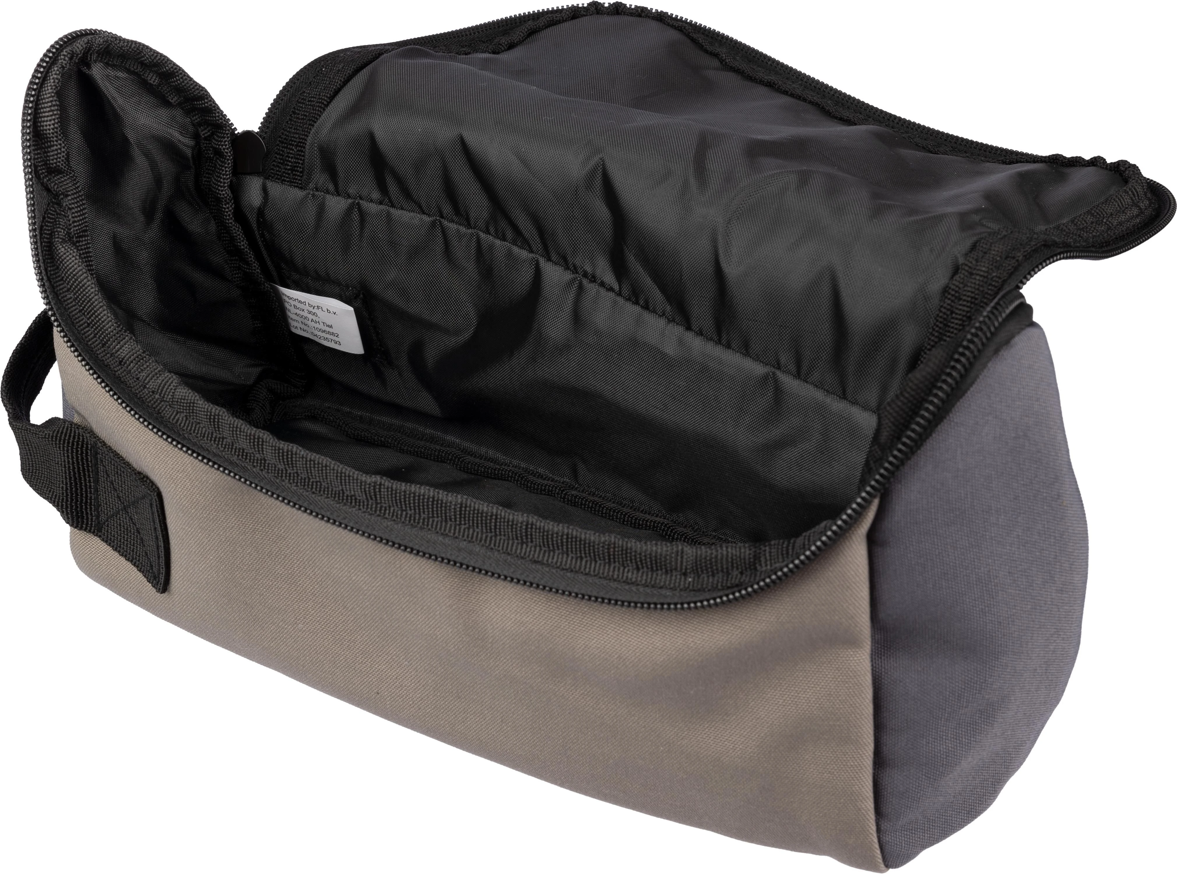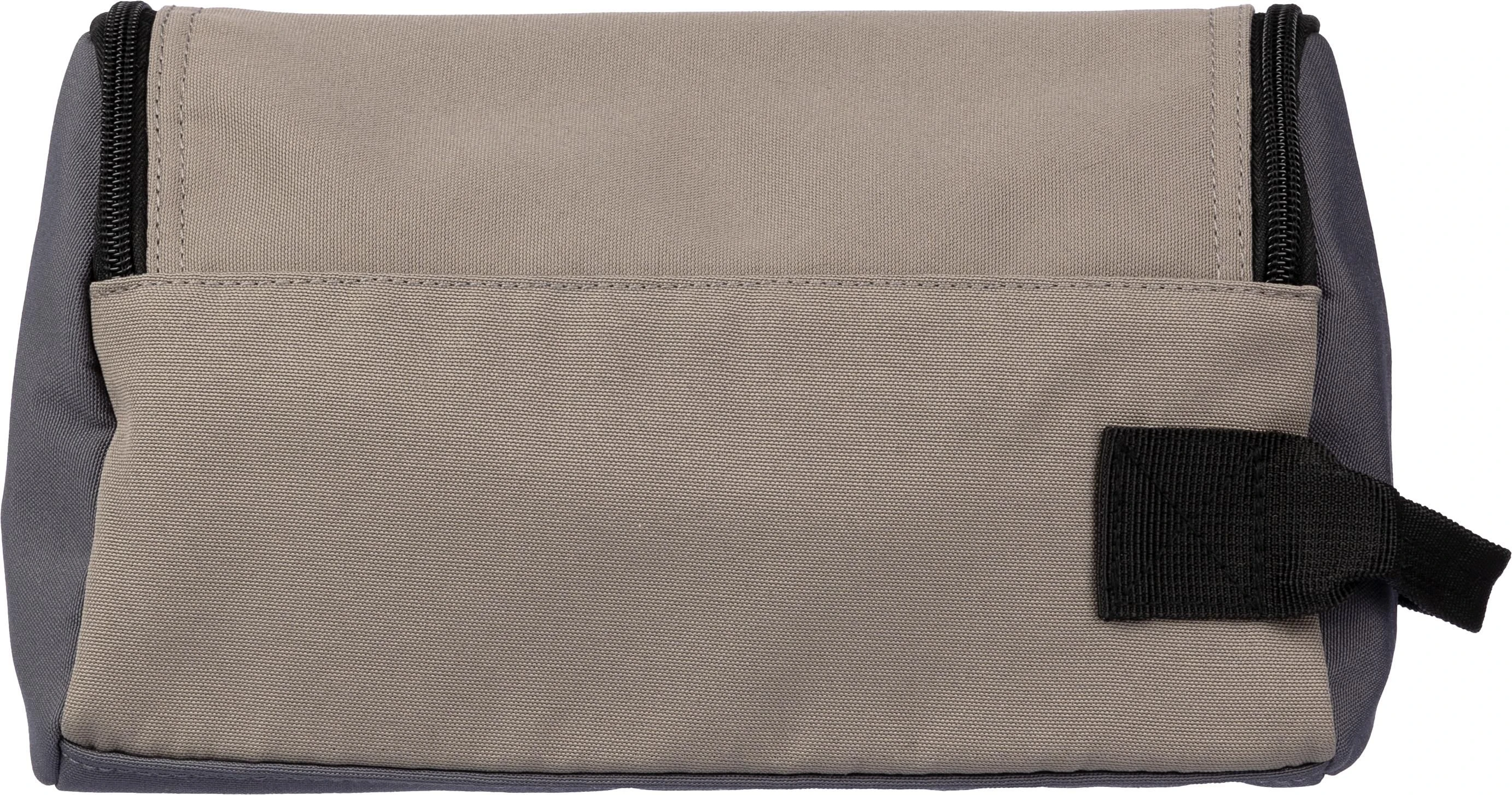 Toaletna torba od poliestera (600D) s podstavom od PU (210D). Veliki pretinac s patentnim zatvaračem na gornjoj strani. Kratka ručka za nošenje.