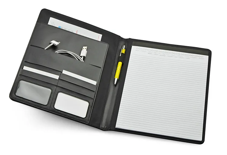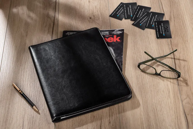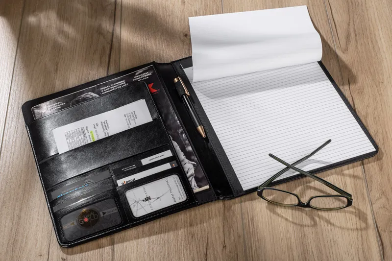 €14.79Elegantna, klasična aktovka izrađena od materijala koji nalikuje koži (PU). Unutra se nalazi 1 veliki džep za dokumente, 1 srednji džep i 6 malih džepova, na primjer, za posjetnice. Opremljena je bilježnicom s linijama (20 A4 listova). Bilježnica nije fiksirana, već se klizi u džep, pa se može lako zamijeniti. Logo se može izraditi koristeći mnoge tehnike na površini mape.