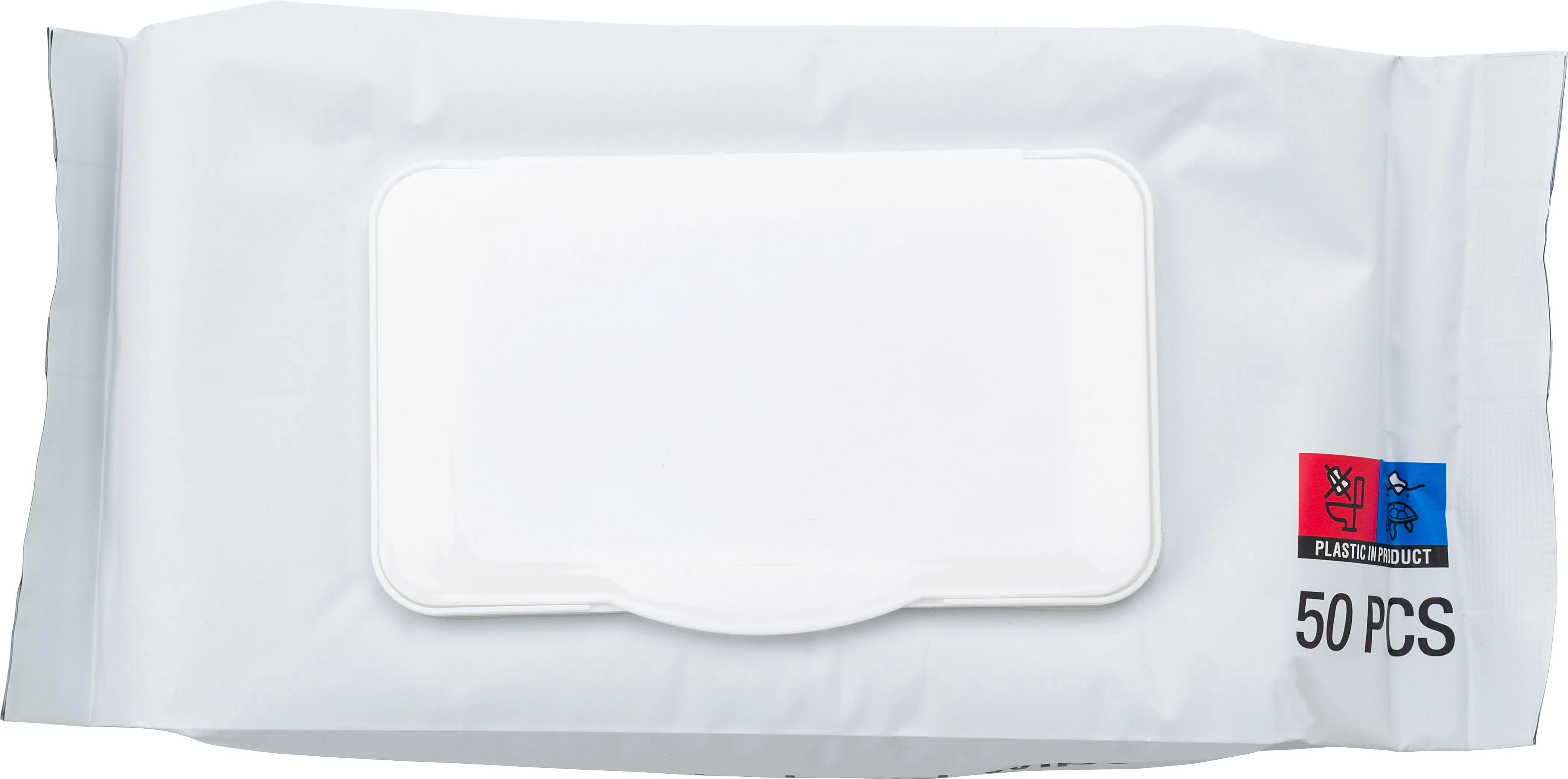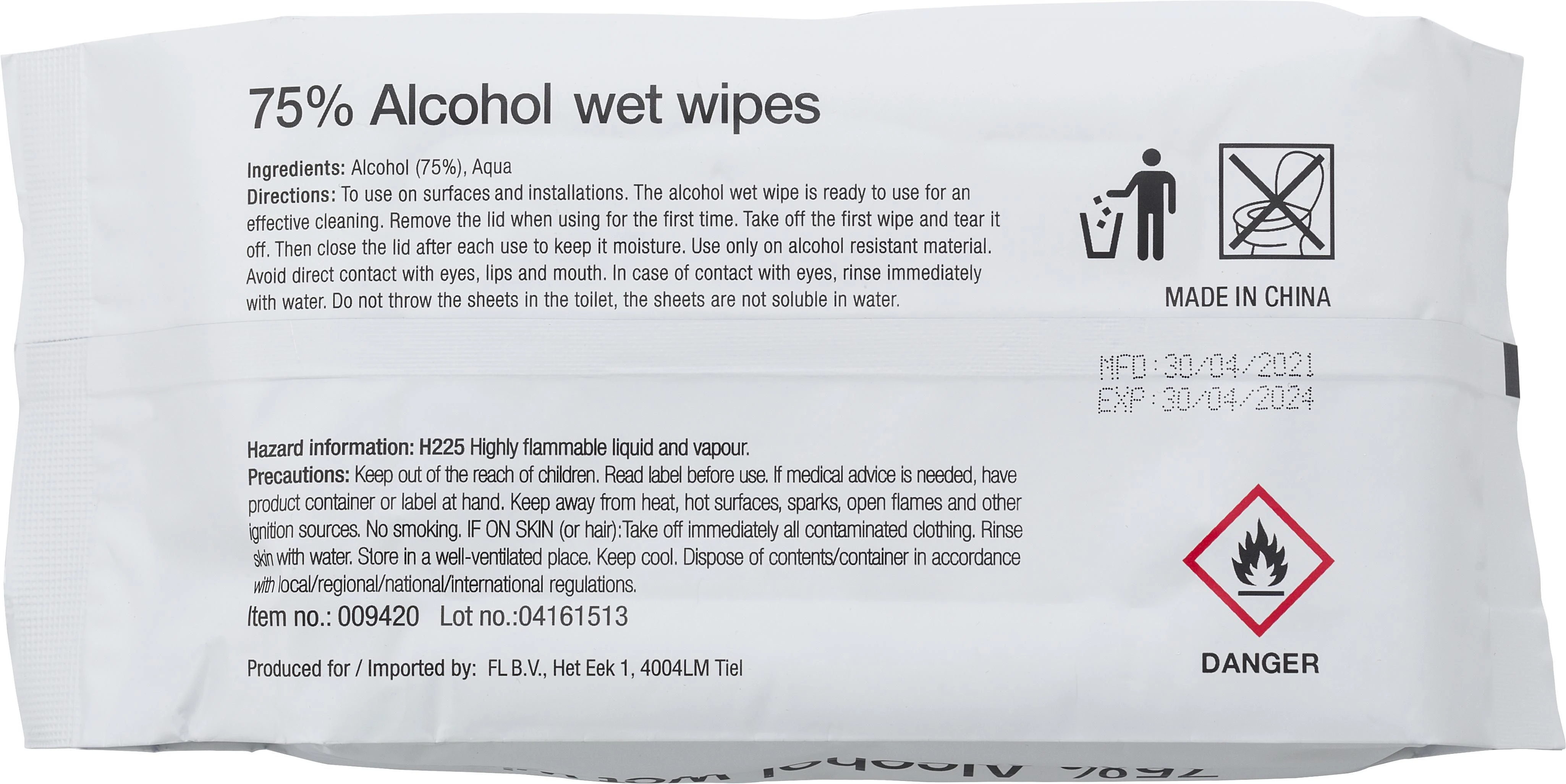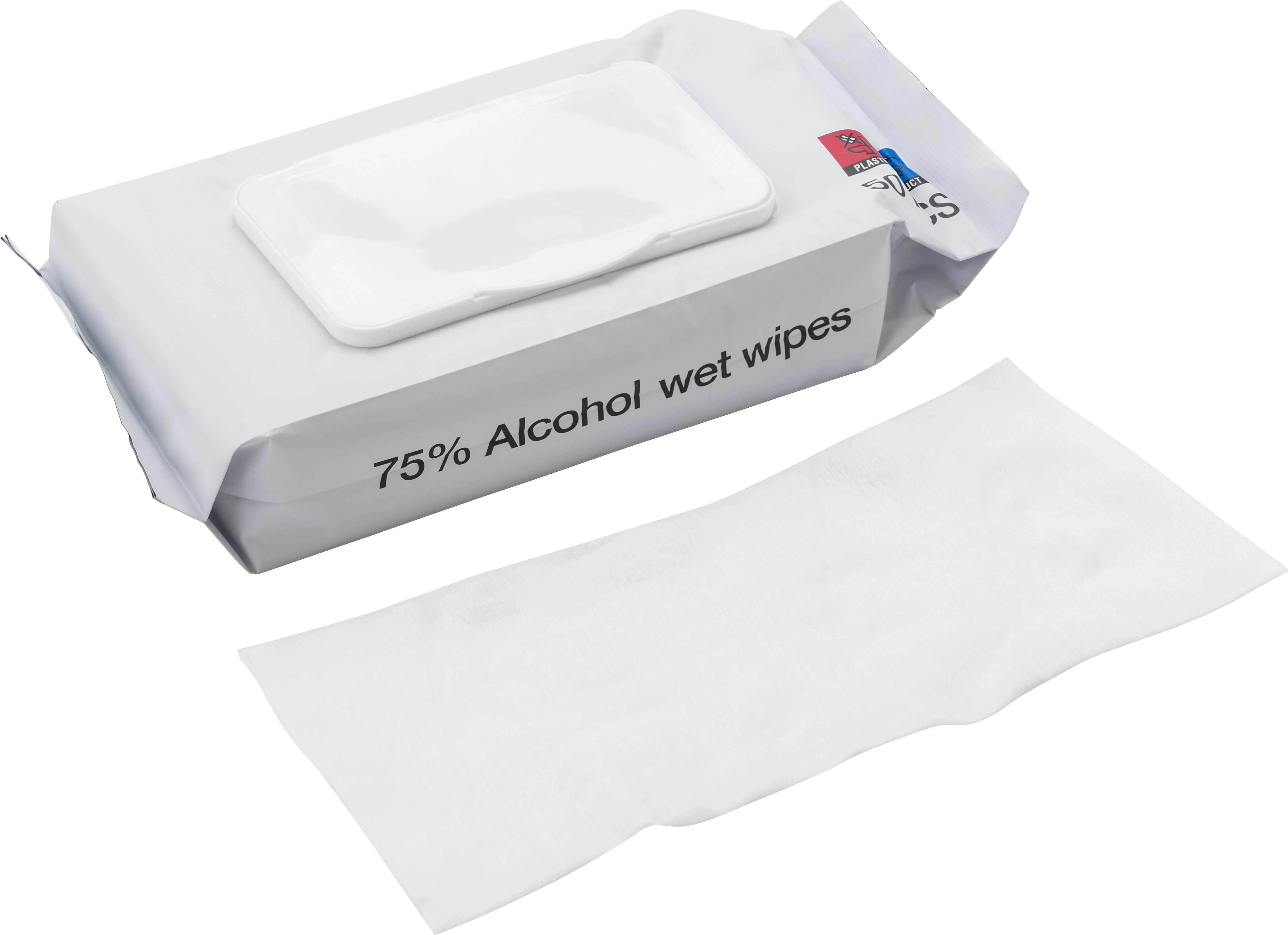 Zatvorena vrećica s 50 komada vlažnih maramica (75% alkohol) rok trajanja do 30. travnja 2024.