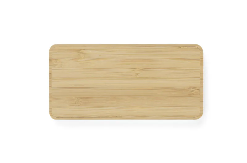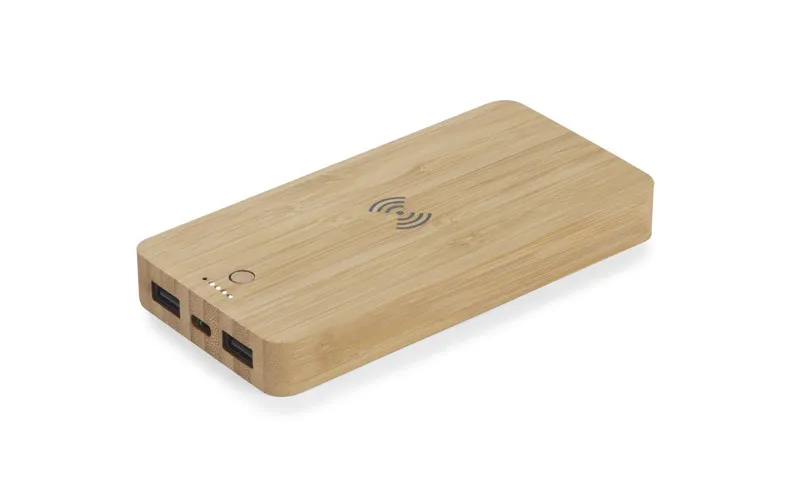 €46.18Bambusov powerbank BORRA kapaciteta 10000 mAh s funkcijom bežičnog punjenja, za punjenje uređaja snagom 10W, zaštićenim kutovima i modernim dizajnom, površina za označavanje, ekološki prihvatljiva alternativa, kabel za punjenje nije uključen, ulaz (USB Type C) 5V/2A, izlaz (2 x USB A) 5V/2.1A (maks.), litij-polimerska baterija