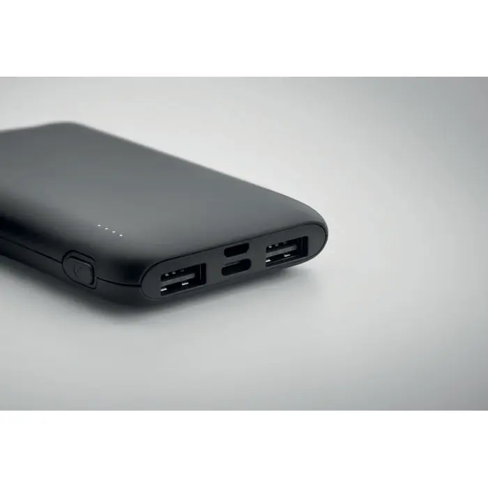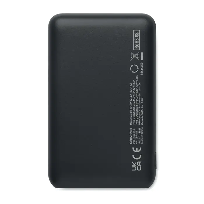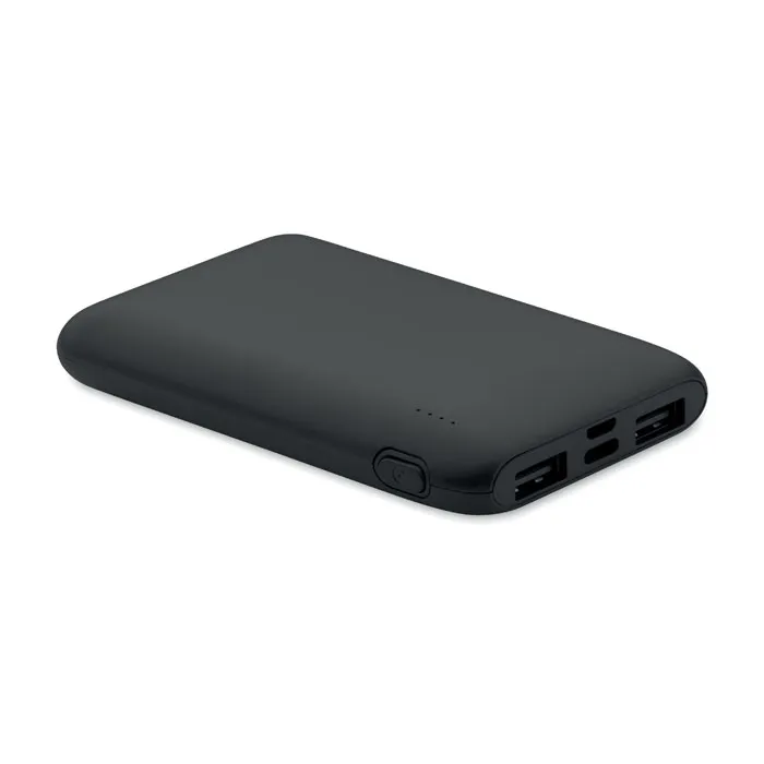Power bank 5000 mAh od recikliranog ABS-a. Kapacitet za upotrebu na pametnom telefonu, Izlaz: 1 x Tip-C, 2 x Tip-A & 1 x Tip-B. Ulaz: 2-u-1 Tip C & Tip-A.