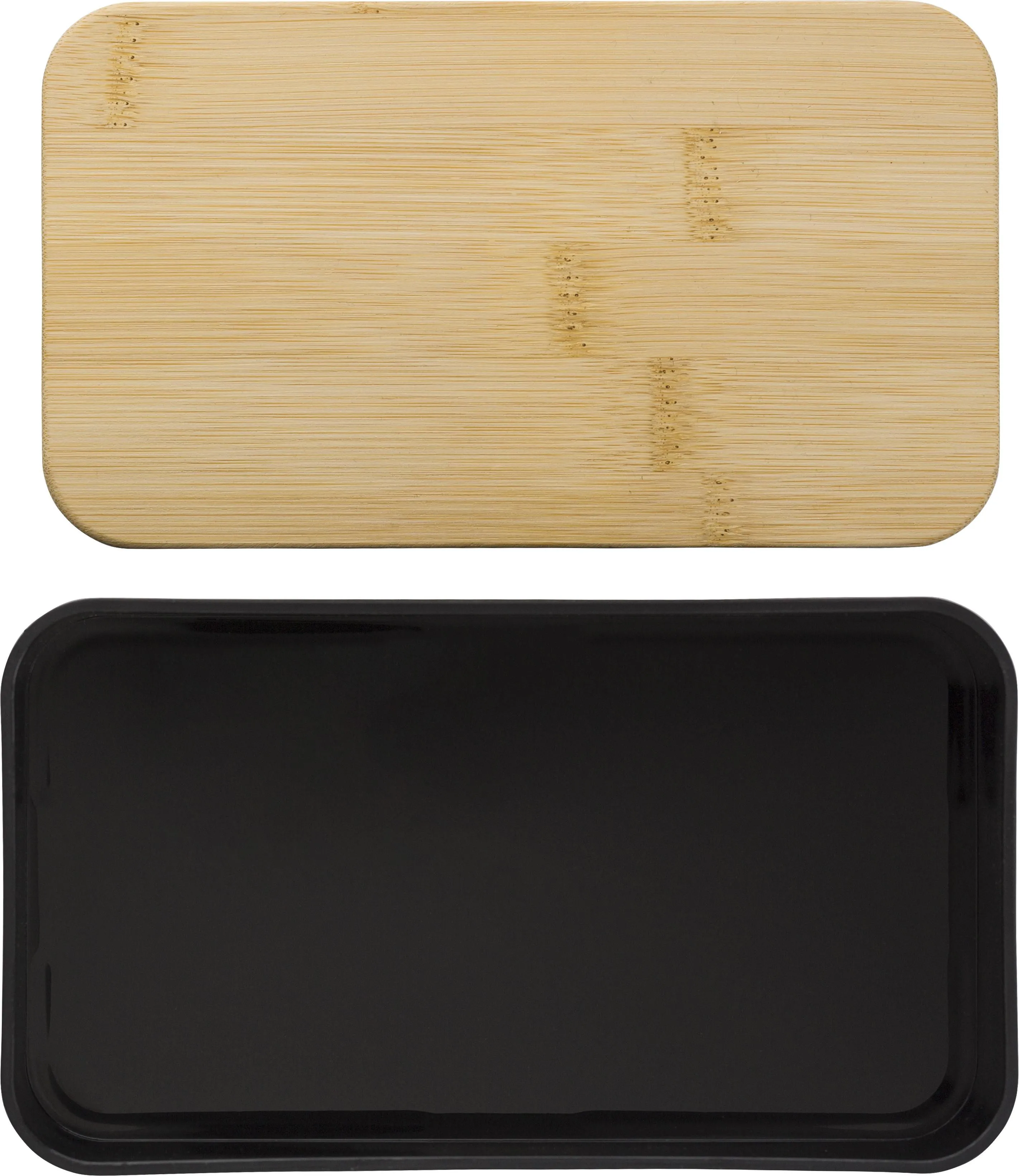 €4.23Dvostruka PP lunch box s više odjeljaka (2 x 400 ml) i poklopcem od bambusa uključuje pregradu i plastični pribor (žlica, vilica i nož) te elastičnu traku