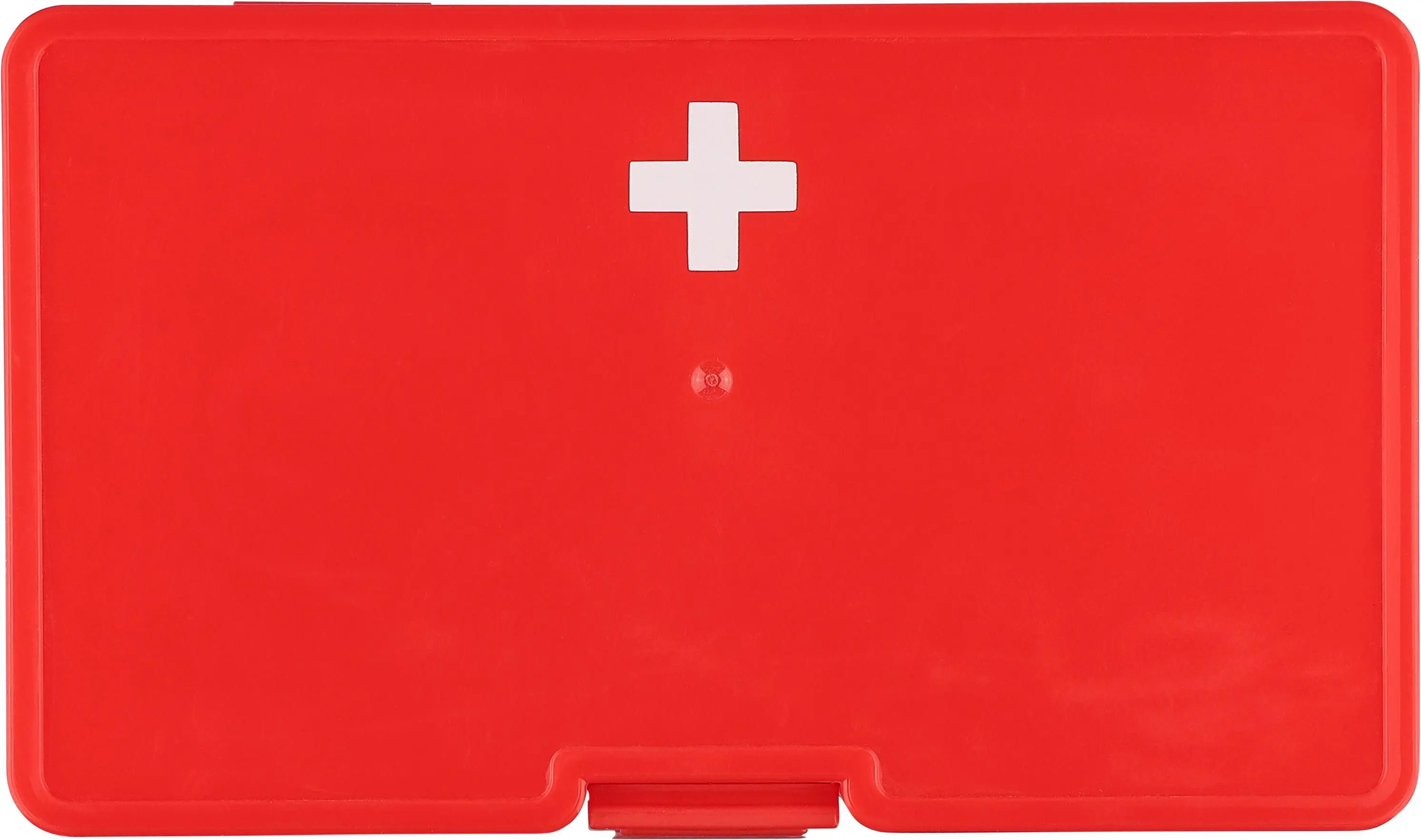 €3.52PP set prve pomoći u crvenoj kutiji s bijelim križem na gornjoj strani i klip zatvaranjem, kompaktni kasetni dizajn sadrži 15 dijelova: 2 netkane spužve, 5 zavoja, 4 alkoholne maramice, 1 škare, 1 rolu gaze (450 cm) i 1 rolu flastera (450 cm)