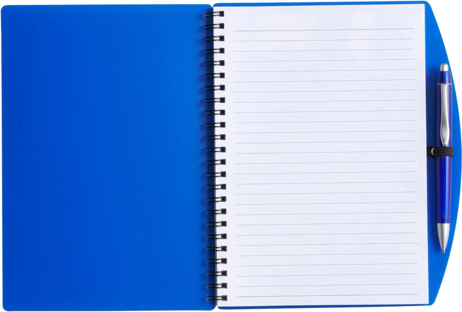 €1.43PP, bilježnica s metalnom spiralom (približno A5) s 65 obloženih stranica i plastična kemijska olovka s plavom tintom.