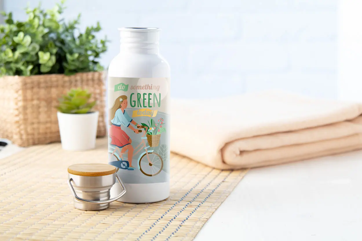 Boca od nehrđajućeg čelika za sublimacijski tisak s bambusovim poklopcem za nošenje. 750 ml.
