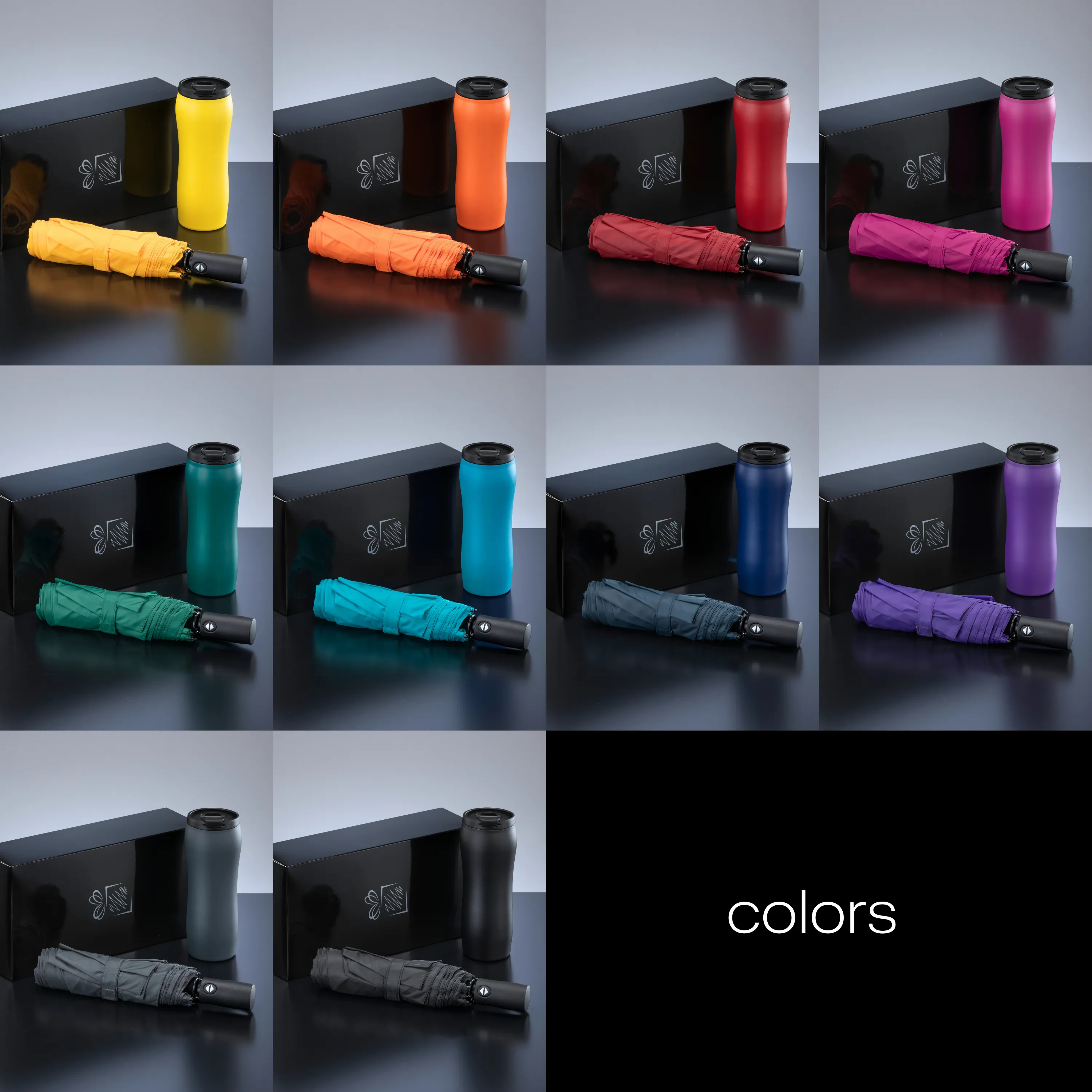 €29.70A practical set for people on the go, including a vacuum thermal mug from Primo collection and a folding automatic umbrella. Leakproof thermal mug is made of high-quality stainless steel, finished with a matte powder coating, which provides not only durability but also great looks. Double walls perfectly retain the desired temperature for up to 6 hours. The click closure design will keep your drink hot and safe. The product is certified for food contact and is BPA-free.