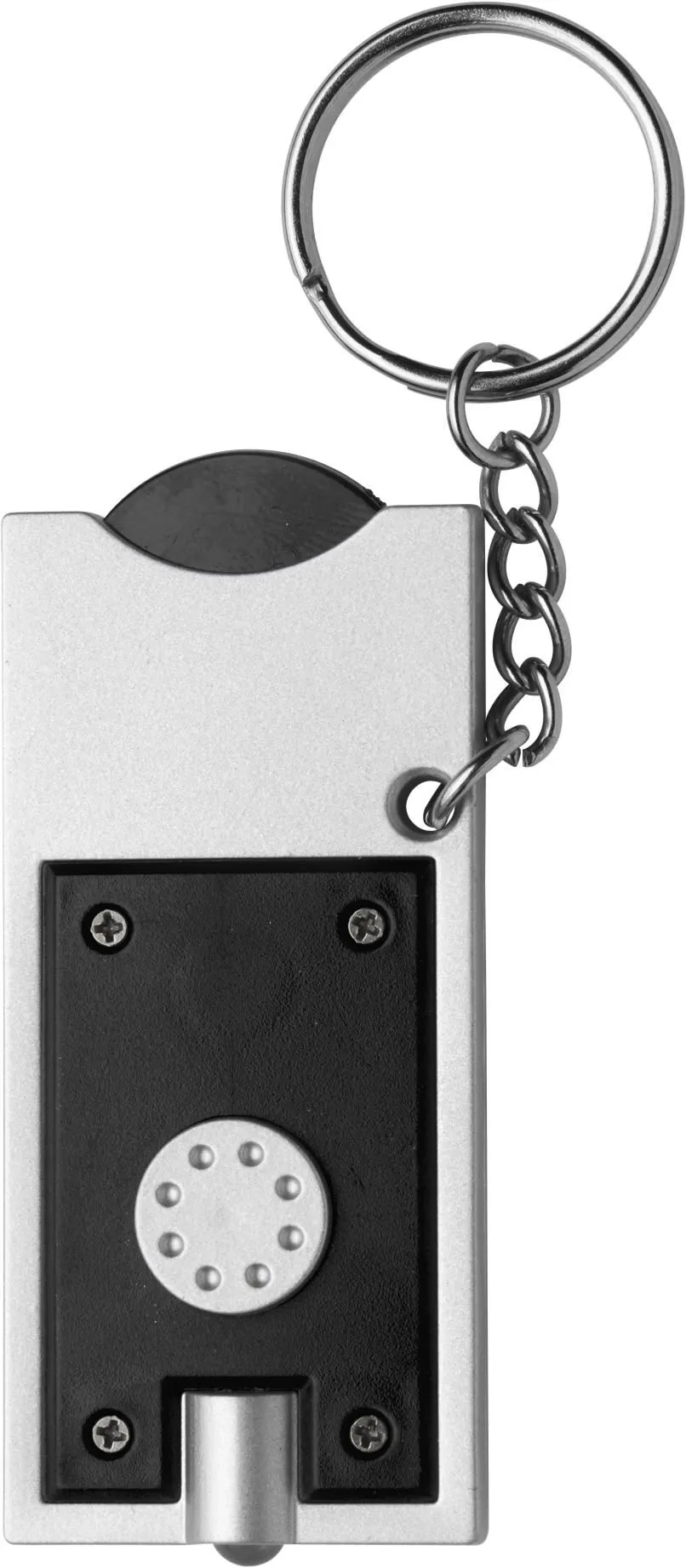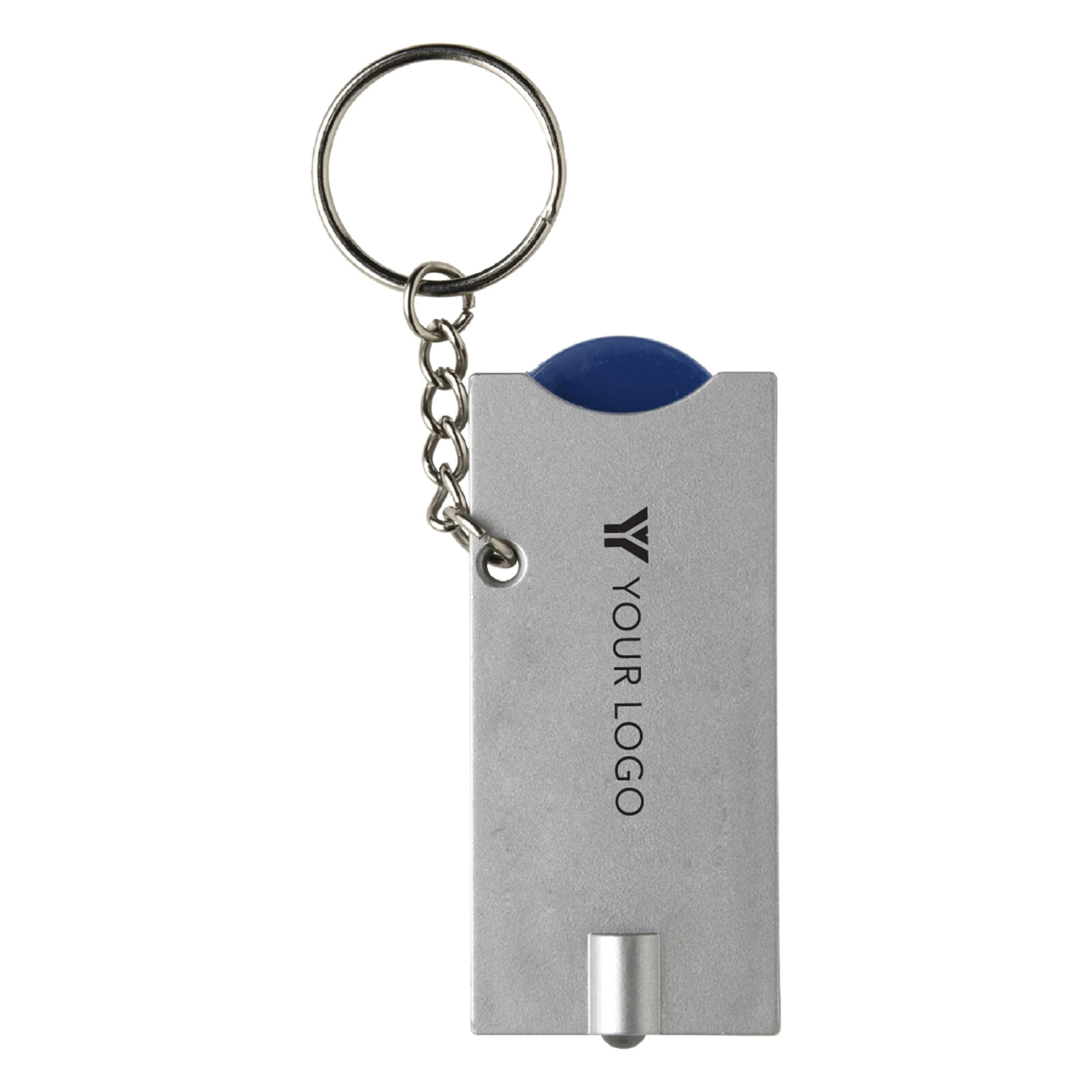€0.55PS privjesak za ključeve s bijelim LED svjetlom i plastičnim novčićem za kolica (veličina 0,50 €), baterije uključene