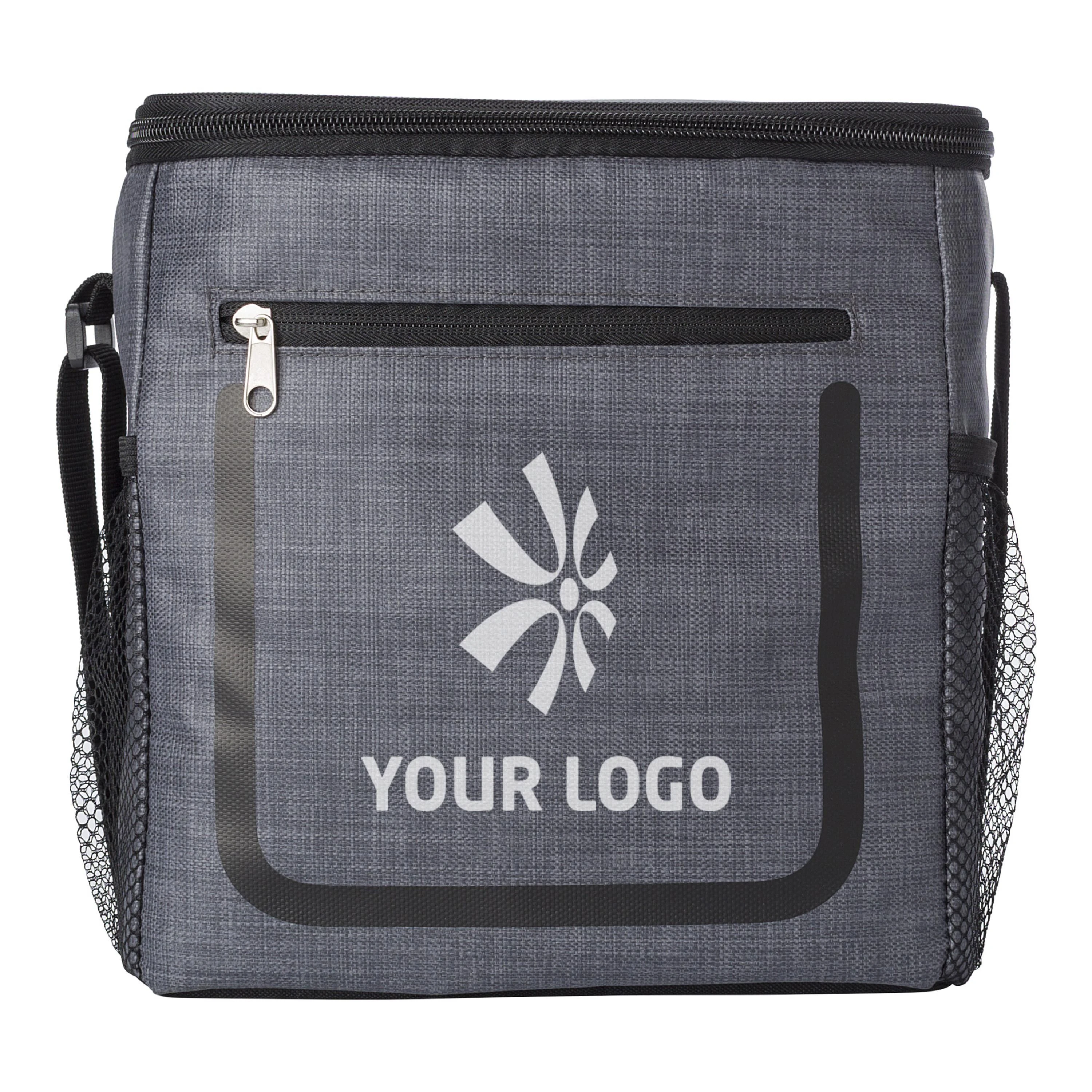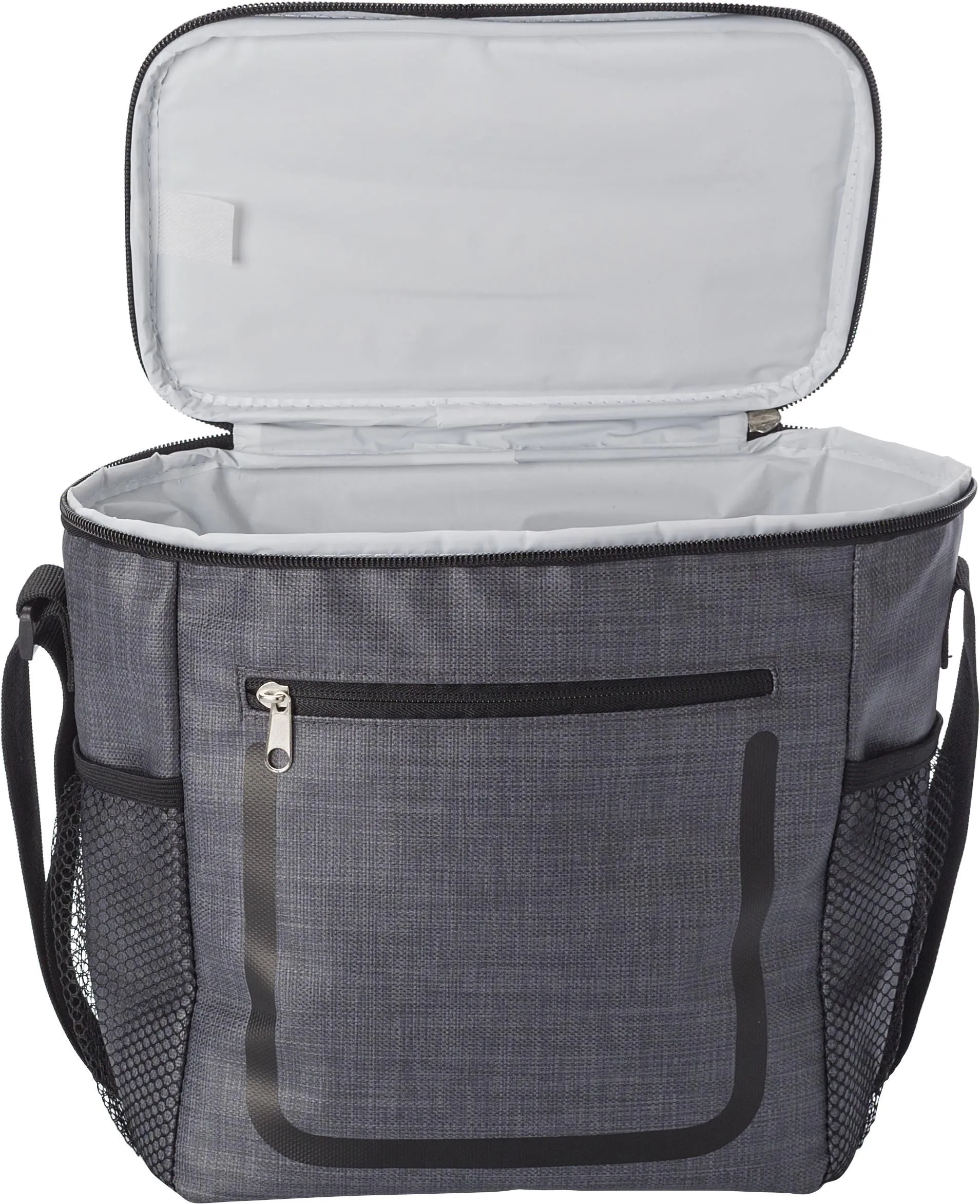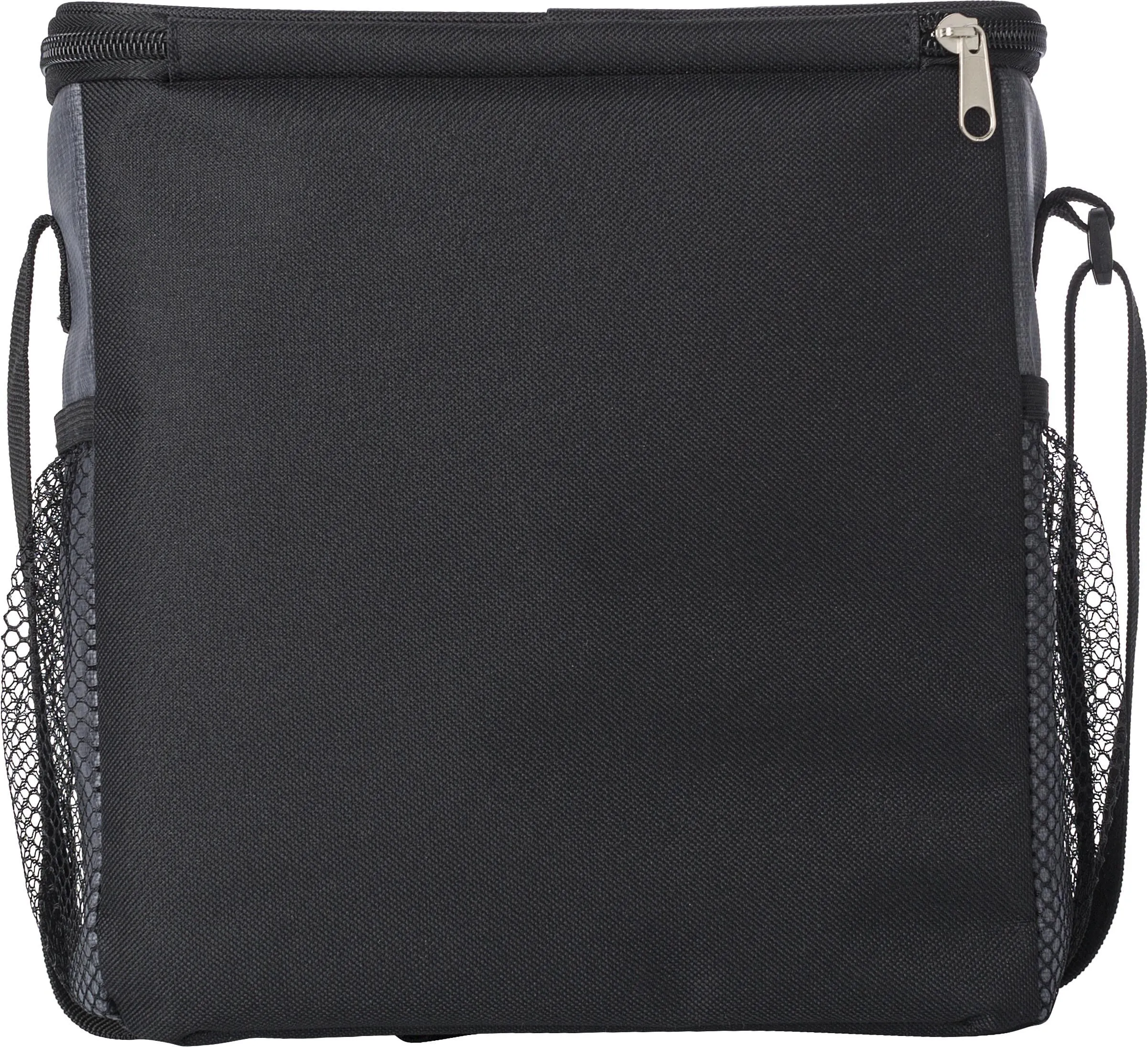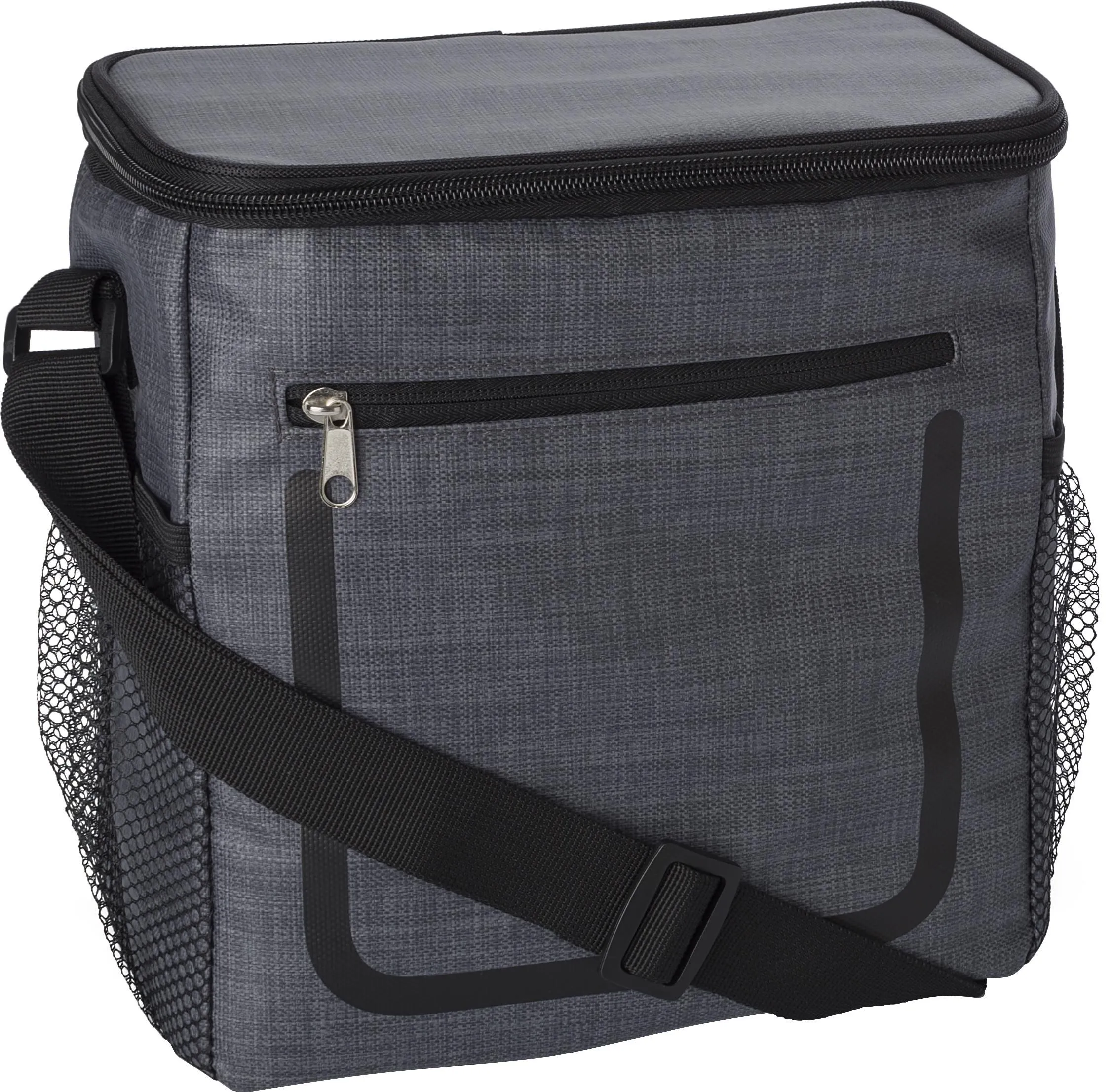 €7.79PU torba za hlađenje s prednjim džepom s patentnim zatvaračem i mrežastim bočnim pretincima, unutrašnjost obložena bijelom termo folijom, podesiva naramenica