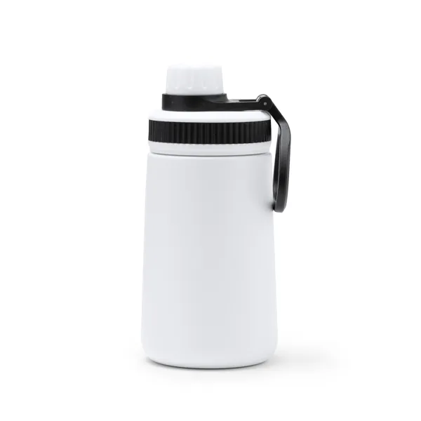 Double-walled stainless steel bottle, with straw and safety cap fastening. Carry handle. Anti-slip base. Capacity: 350 ml. Presentation in design box.