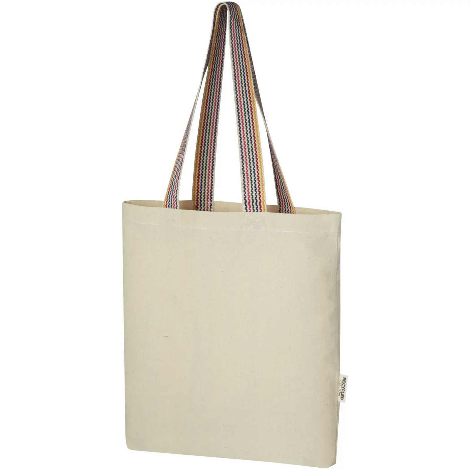 Tote torba Rainbow mase 180 g/m² izrađena od recikliranog pamuka iz pretkonzumne proizvodnje, s ručkama od šarenog remena duljine 25 cm i dnom s proširenjem od 3,5 cm za dodatni prostor, nosivost do 5 kg