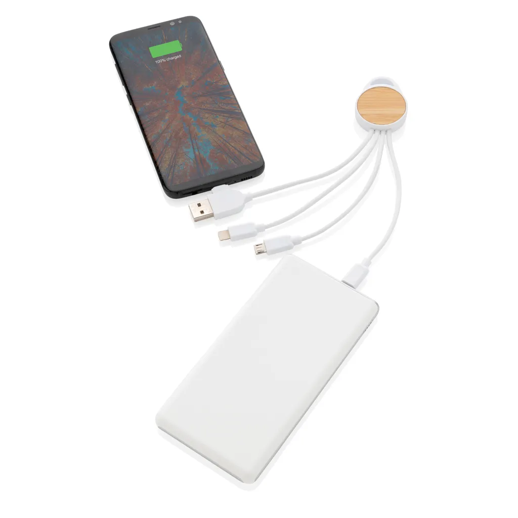 €4.50Kompaktan i prijenosan multi kabel izrađen od certificiranih recikliranih materijala s 5 različitih priključaka: USB C in, USB A in, type C out, IOS out i micro USB out, omogućuje korištenje s uređajima s type C izlazom kao što su novije generacije telefona i macbook računala, ima i USB A izlazno-ulaznu opciju za punjenje bilo kojeg uređaja s bilo kojeg izvora, kućište od FSC® bambusa i RCS recikliranog TPE materijala, kabeli od RCS certificiranog recikliranog TPE materijala, ukupni udio recikliranog materijala: 82% prema ukupnoj masi proizvoda, maksimalna duljina kabela: 20 cm, pakirano u FSC® kraft omot, bez PVC-a