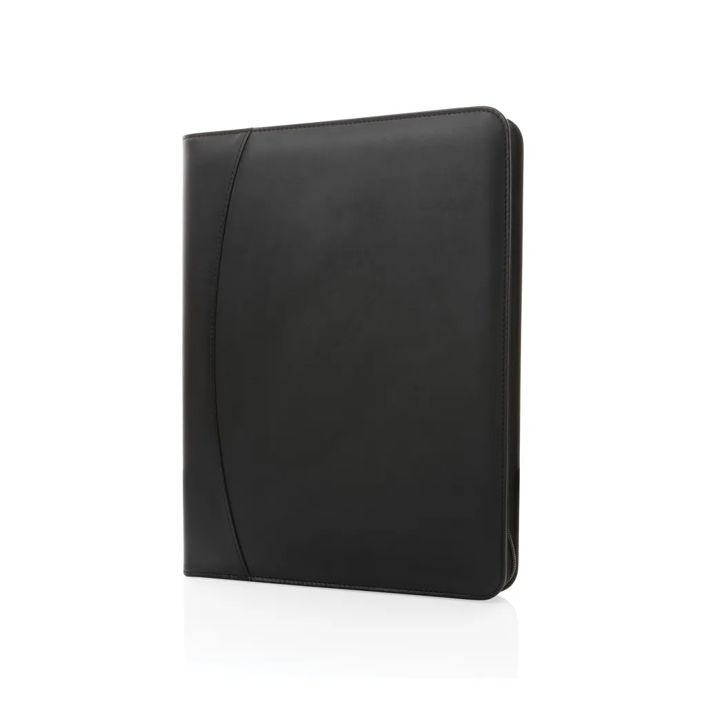 RCS rPU tehnička mapa s patentnim zatvaračem izrađena od RCS certificiranih recikliranih materijala, glatka površina, unutra A4 blok od 20 listova recikliranog papira s crtama (64 g/m²), džep za telefon, držač za telefon, držač za olovku, 2 utora za posjetnice, 100% reciklirani RCS PU, ukupno 14% recikliranog sadržaja, bez PVC-a