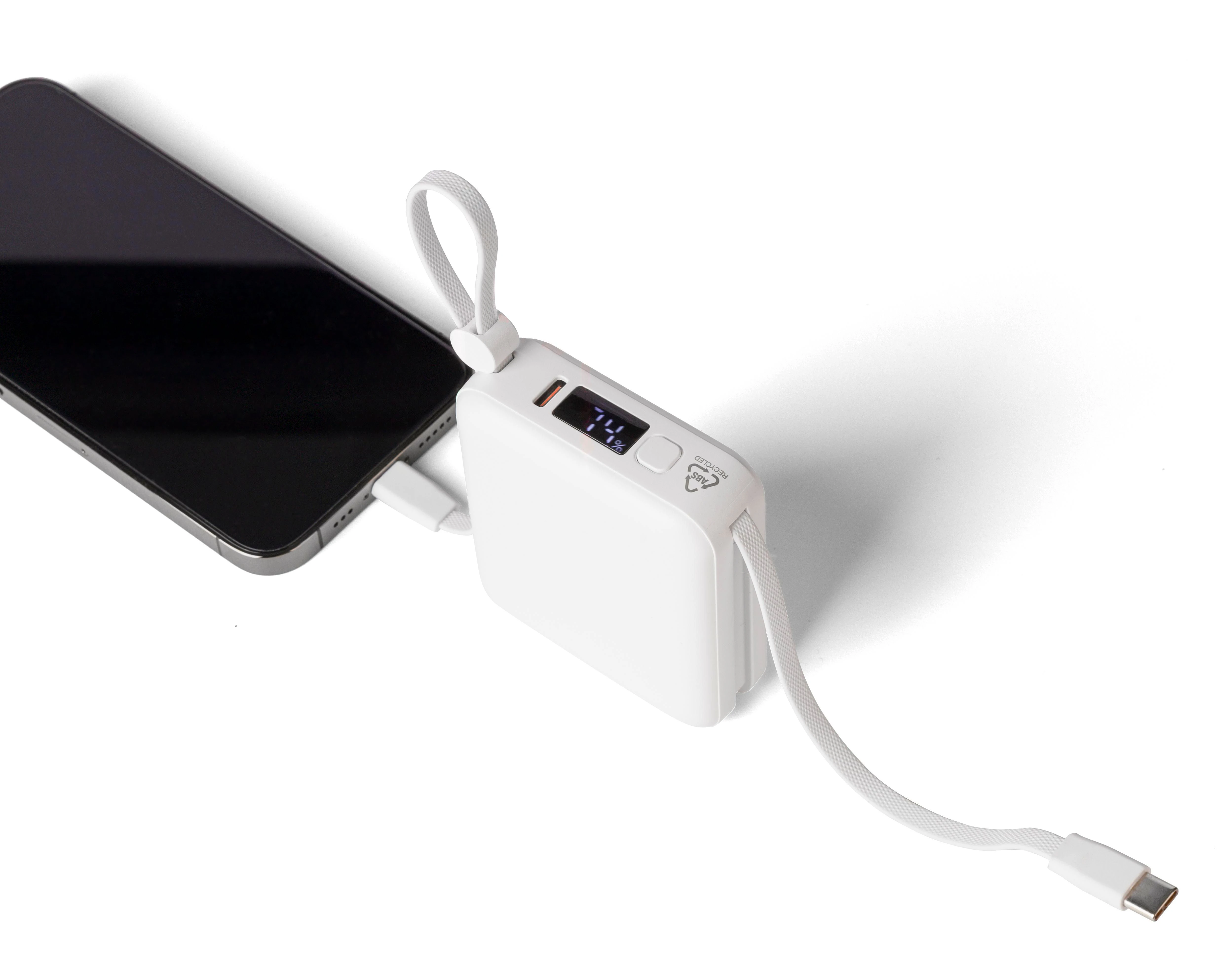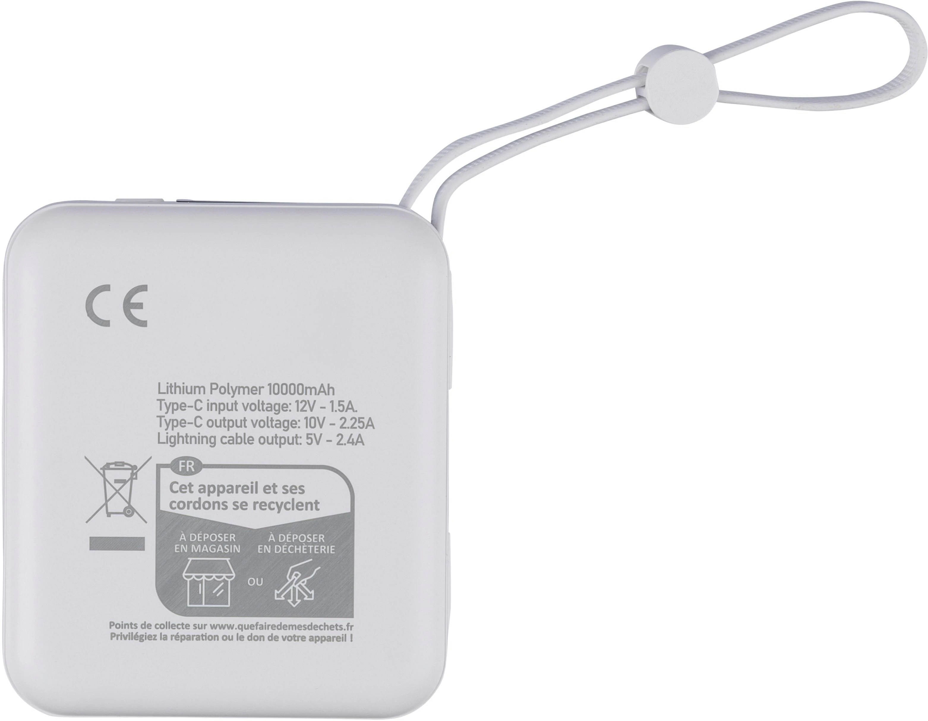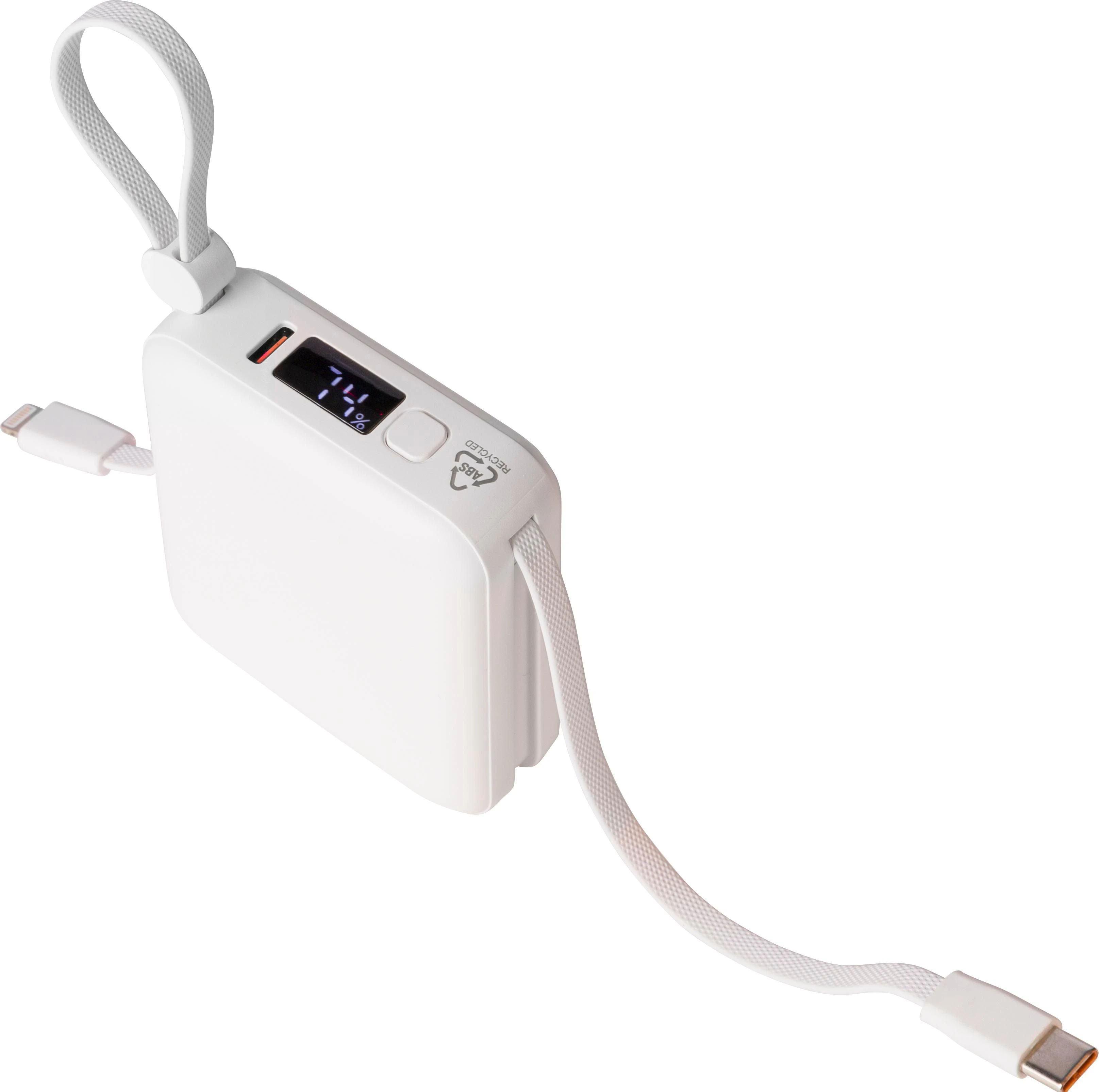€27.06Powerbank od recikliranog ABS-a s Li-ion baterijom 10.000 mAh i brzim punjenjem 22,5W, integrirana TPE vezica koja služi i kao kabel za punjenje s Lightning i Type-C priključcima, digitalni LED zaslon na vrhu za prikaz kapaciteta baterije, Type-C ulaz/izlaz i Type-A ulaz, zaštita od pregrijavanja, kratkog spoja, prenapona i preopterećenja, etiketa s logom recikliranog ABS-a na stražnjoj strani, pojedinačno pakiran u smeđu kartonsku kutiju s papirnatim omotom