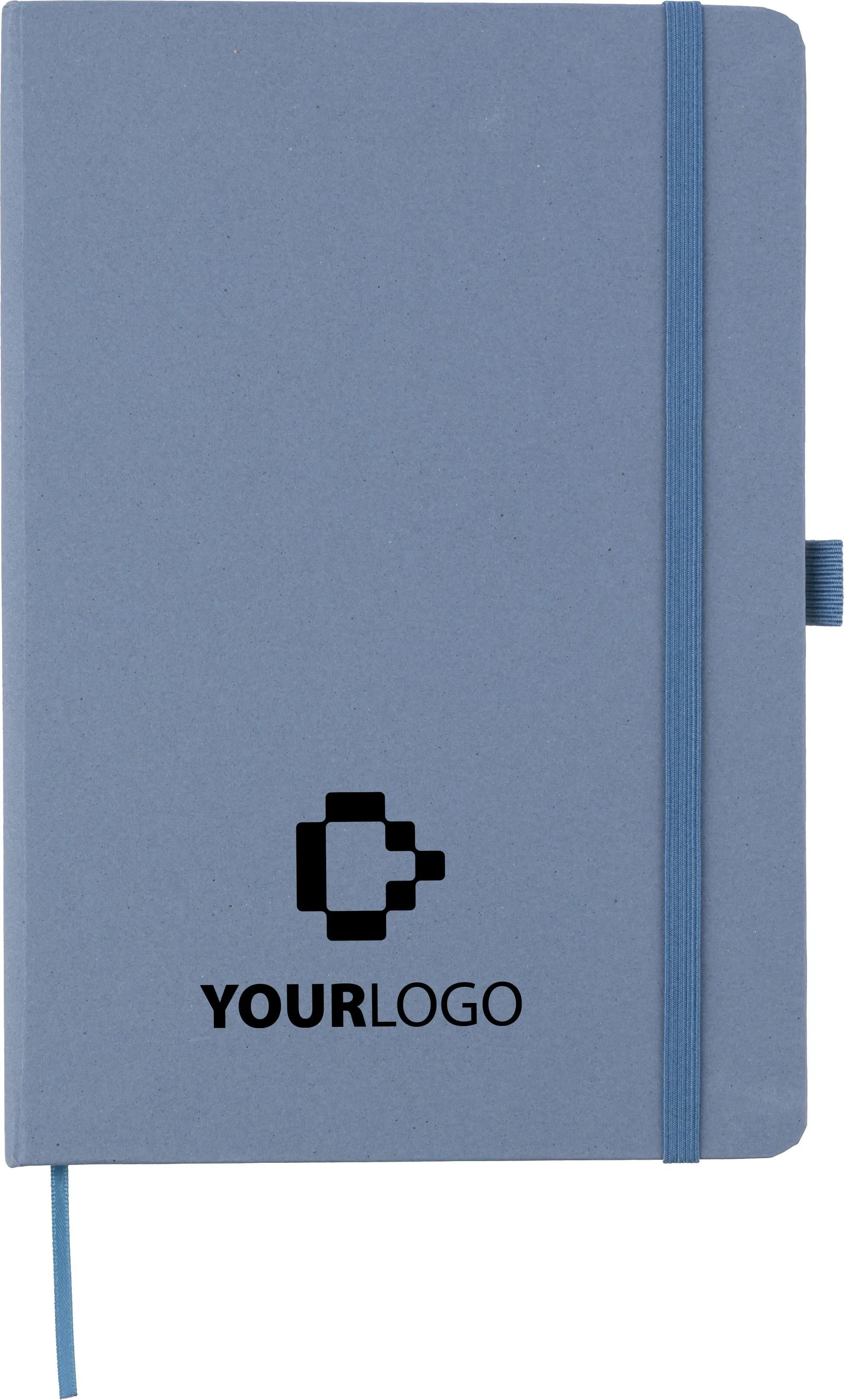 Recycled biowaste (15%) and carton notebook (85%) A5 with 80 lined pages, printed with soy ink. The paper in this notebook is FSC® Mix certified. Each notebook features embossing on the backside corresponding to the color of the referred waste: green for citrus, red for cherry, blue for lavender, khaki for grapes, and light brown for hazelnut. The notebook is covered with Favini paper from Italy and includes 70gsm paper.