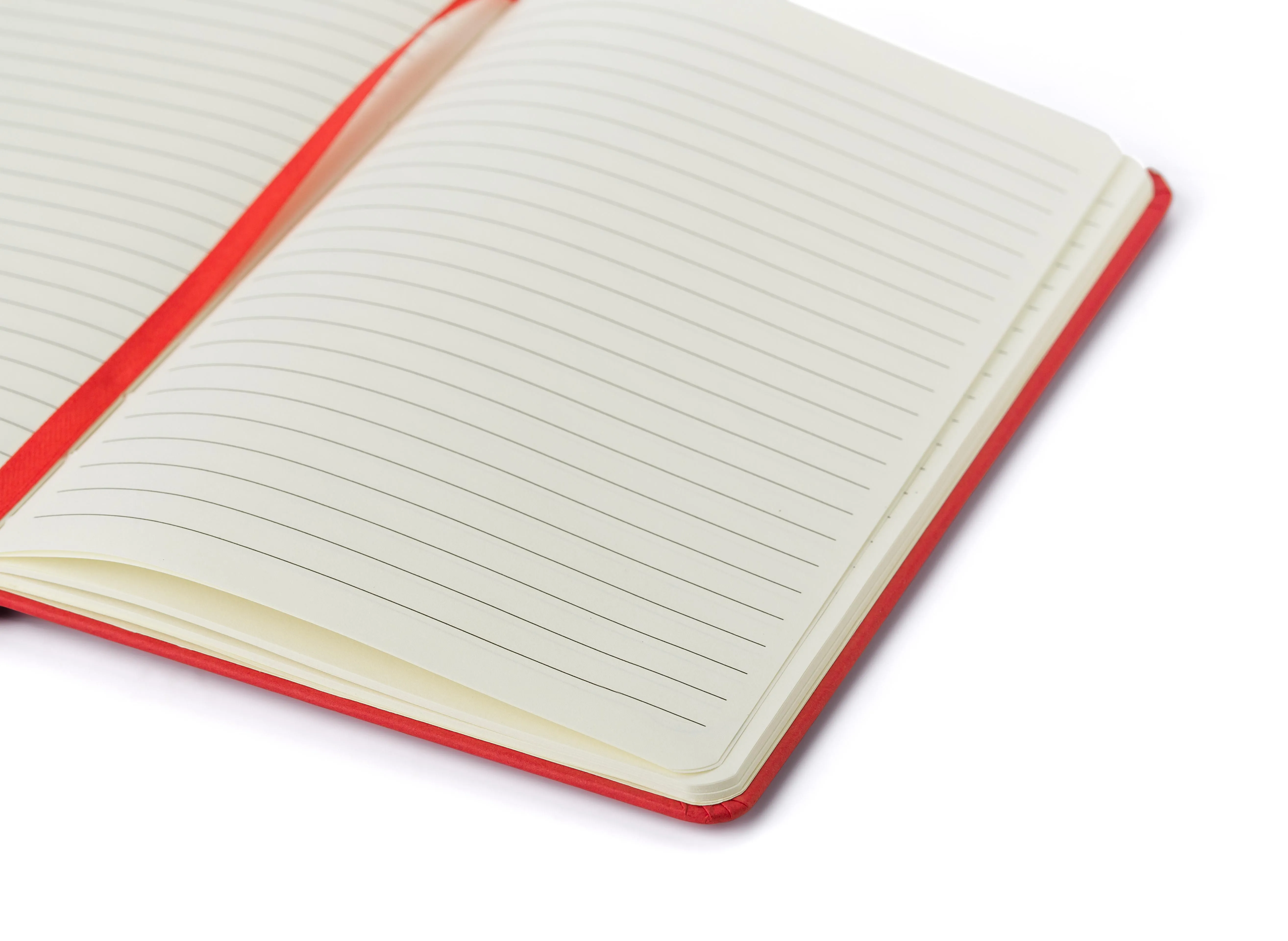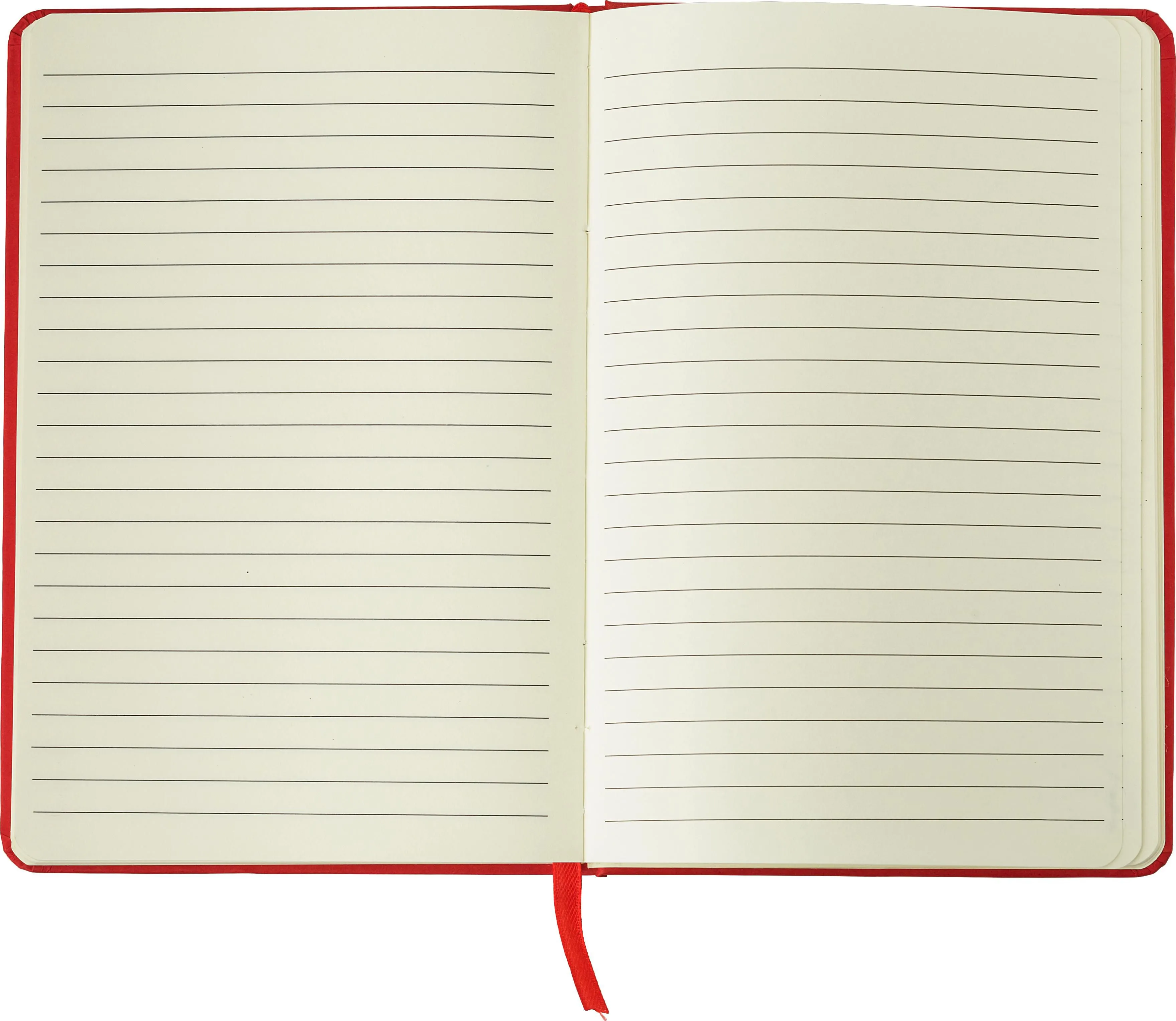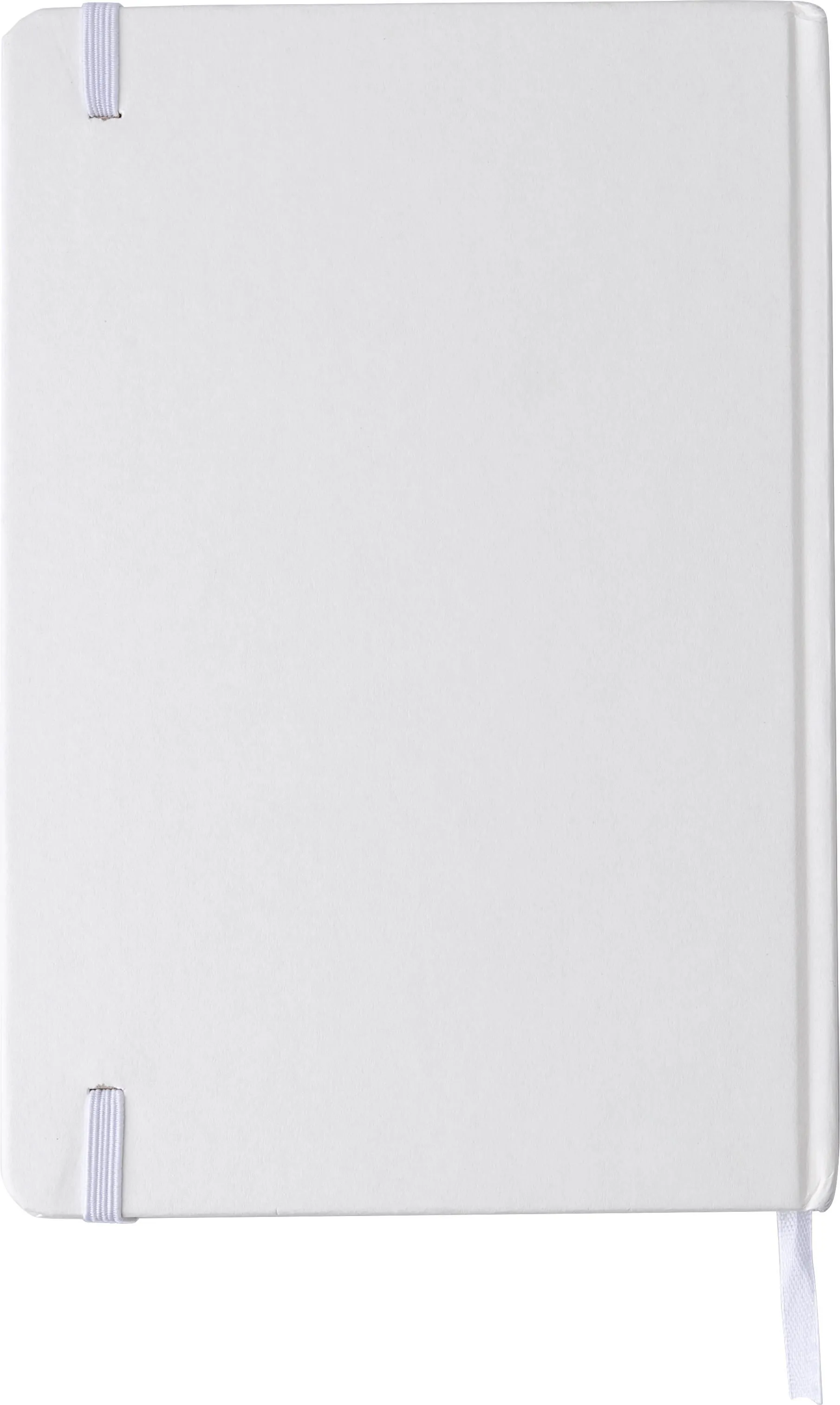 Recycled carton notebook (A5) with 160 lined pages. The paper in this notebook is FSC® Mix certified. With elastic to keep closed and a ribbon bookmark in same color.