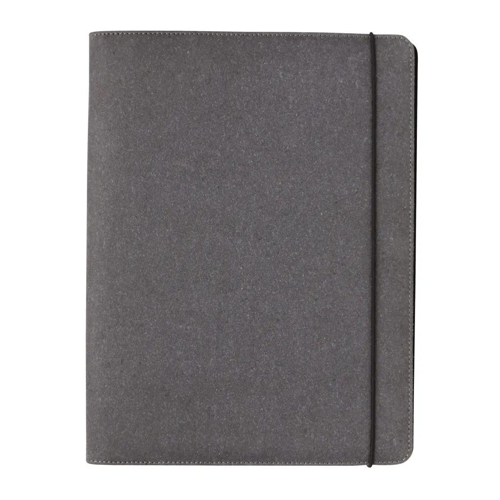 Portfolio od reciklirane kože s crnom elastičnom trakom za zatvaranje, unutra blok od recikliranog papira gramature 64 g/m² s 20 stranica, jedan veliki pretinac, tri pretinca veličine za telefon i četiri pretinca za posjetnice