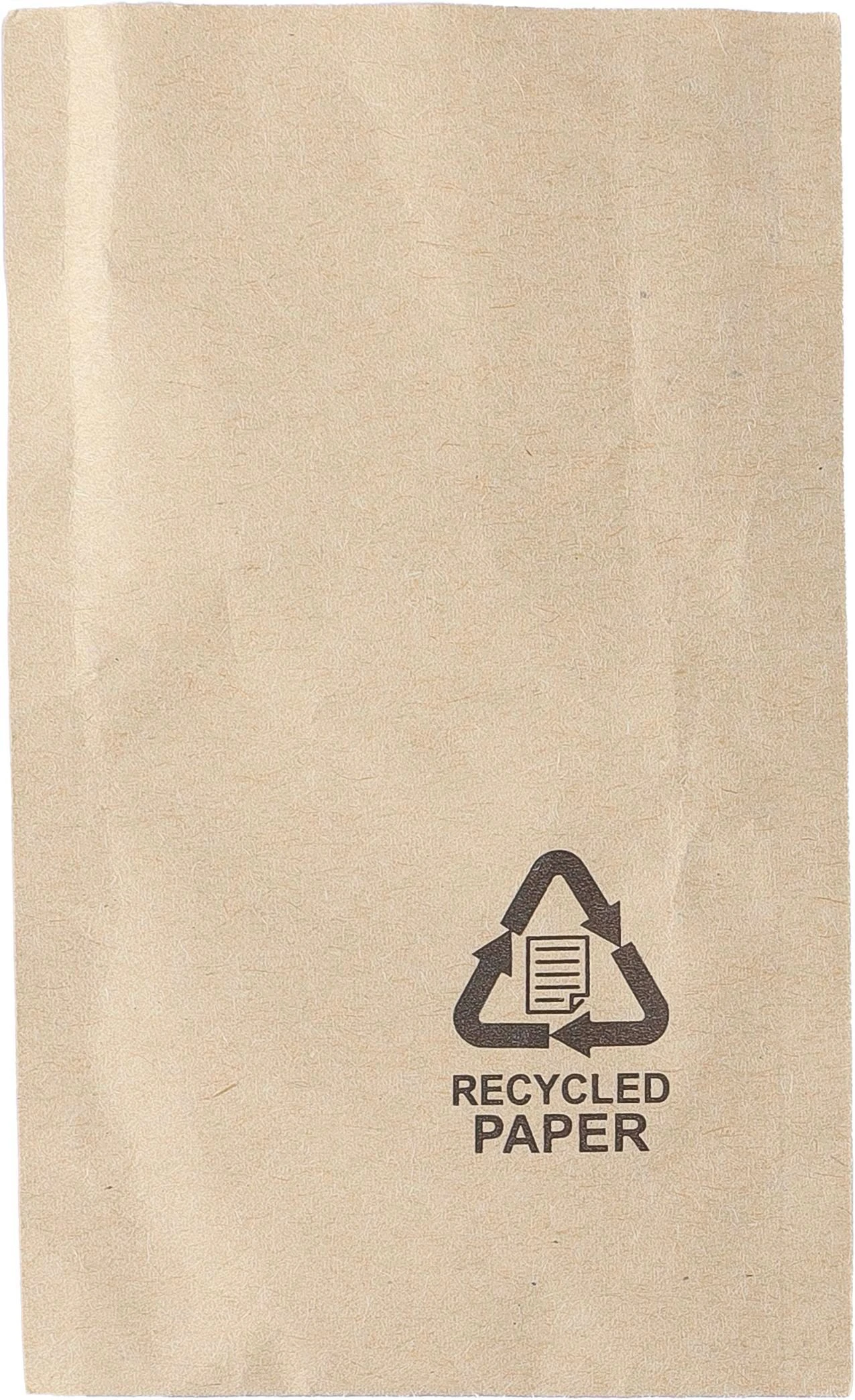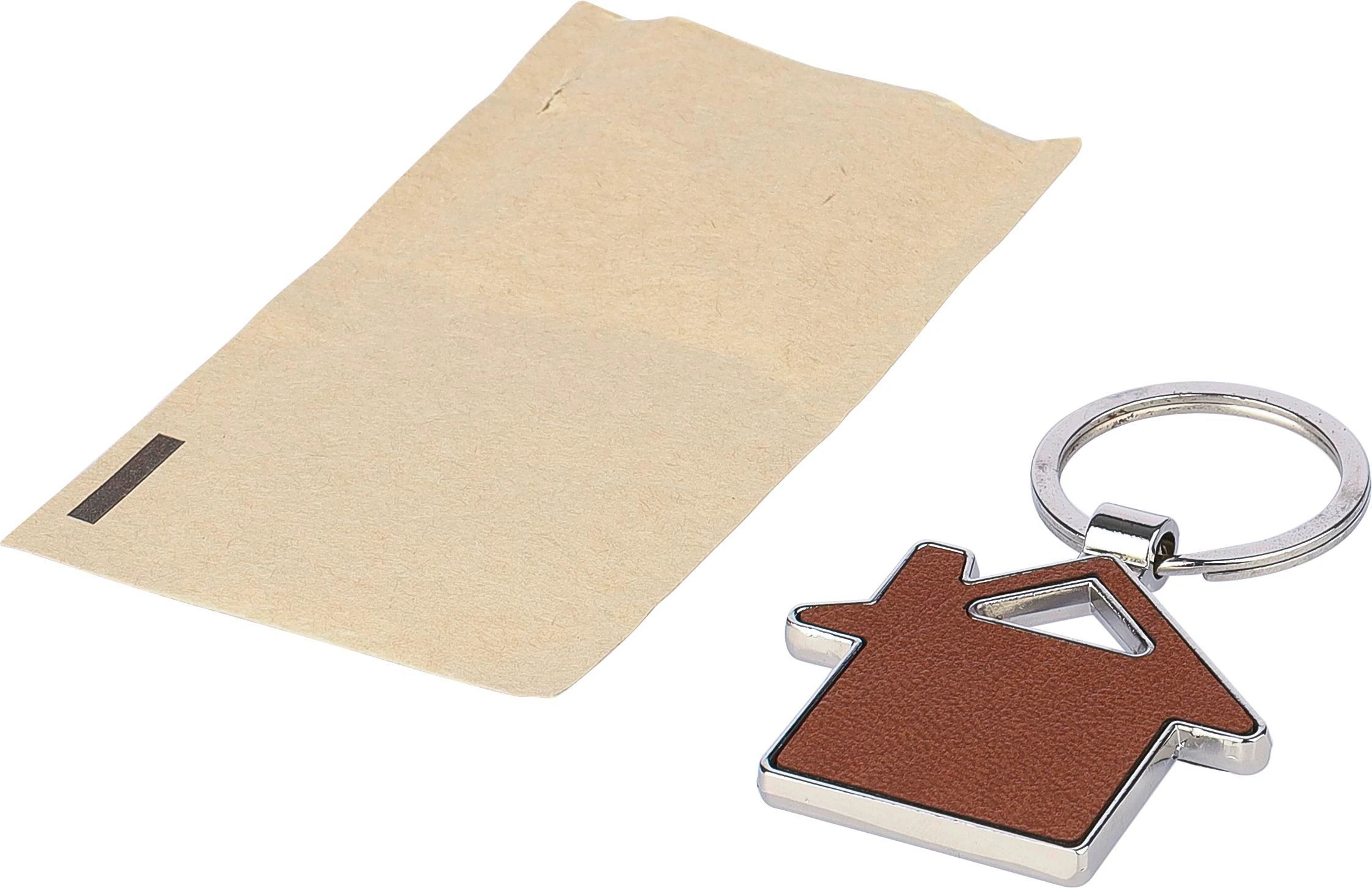 Privjesak za ključeve od reciklirane kože s metalnim prstenom u obliku kuće s utisnutim logotipom reciklirane kože na strani pojedinačno pakiran u smeđoj kartonskoj omotnici