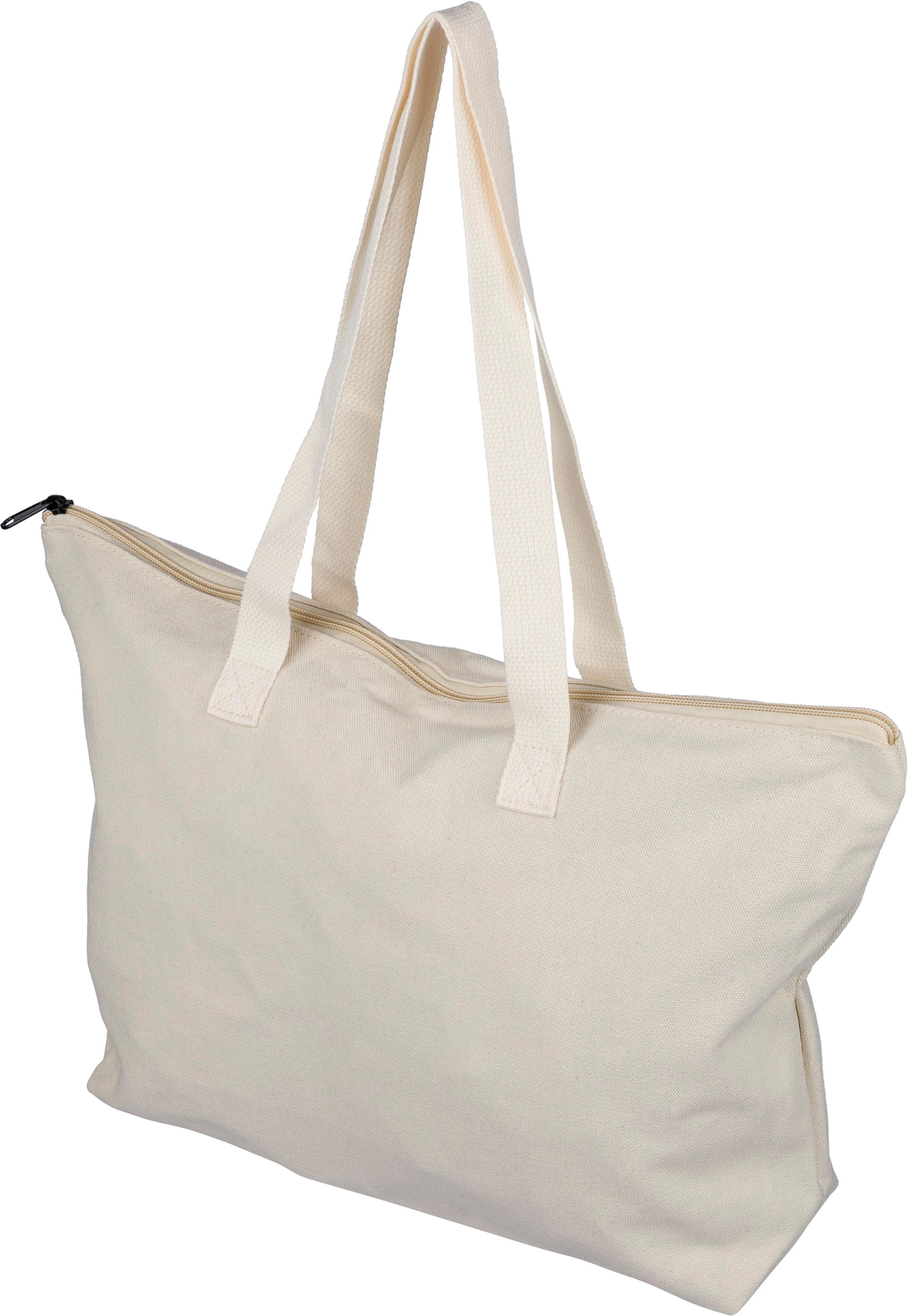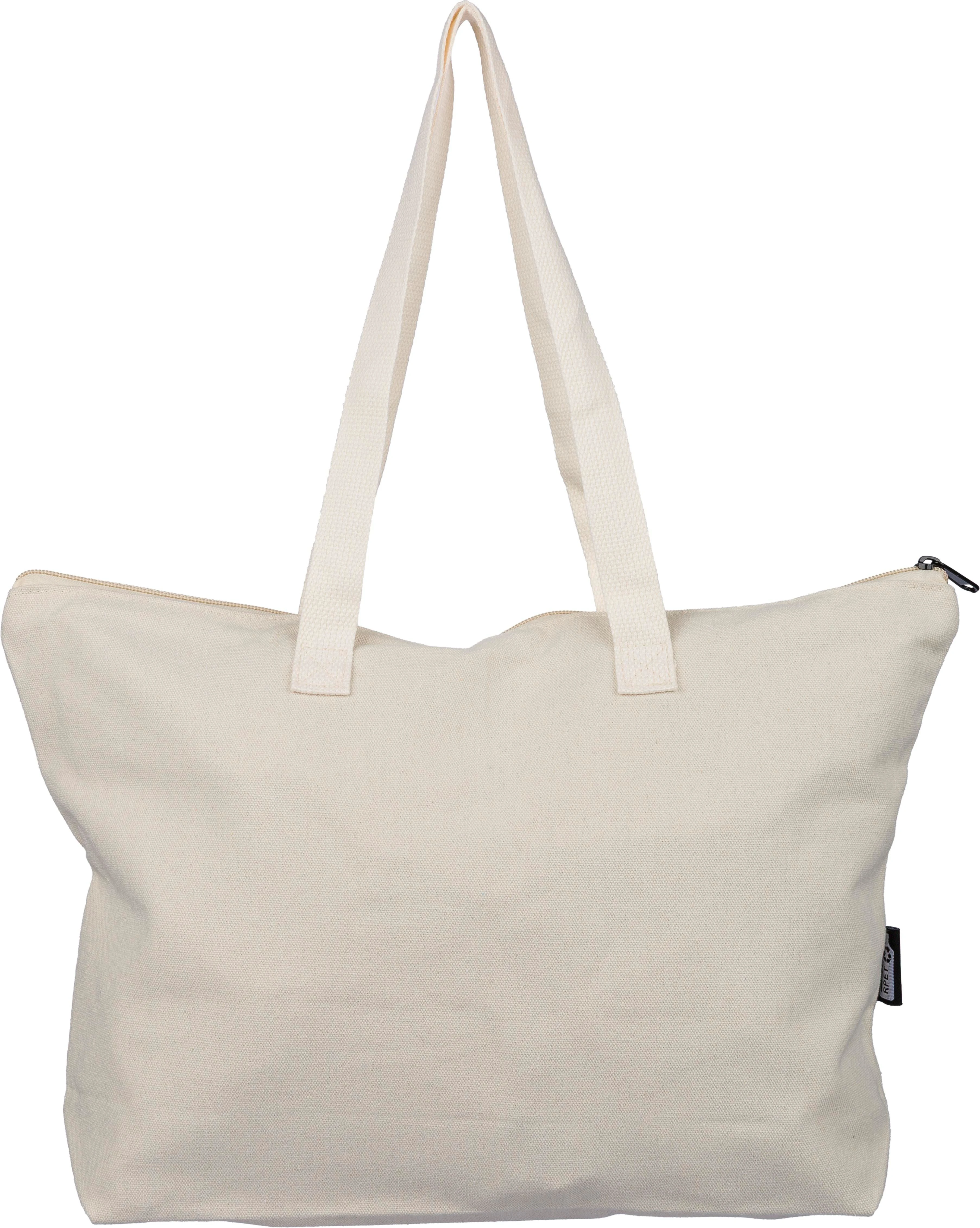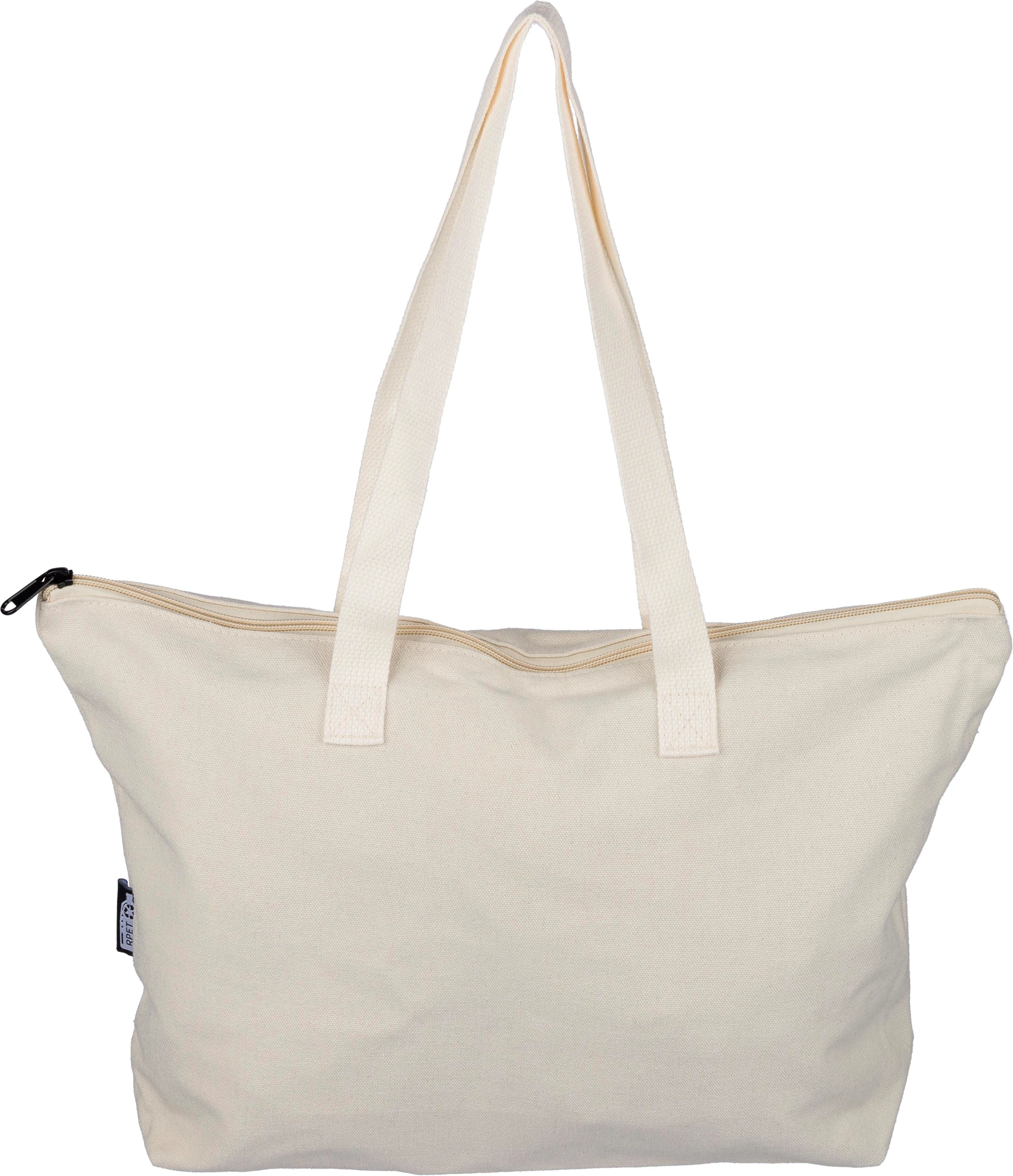 Torba od recikliranog polikotona (330 g/m²) s velikim gornjim pretincem na patentni zatvarač, duge ručke za nošenje (duljina 65 cm, širina 2,5 cm) i odgovarajuća traka, vanjska rPET etiketa i unutarnja etiketa
