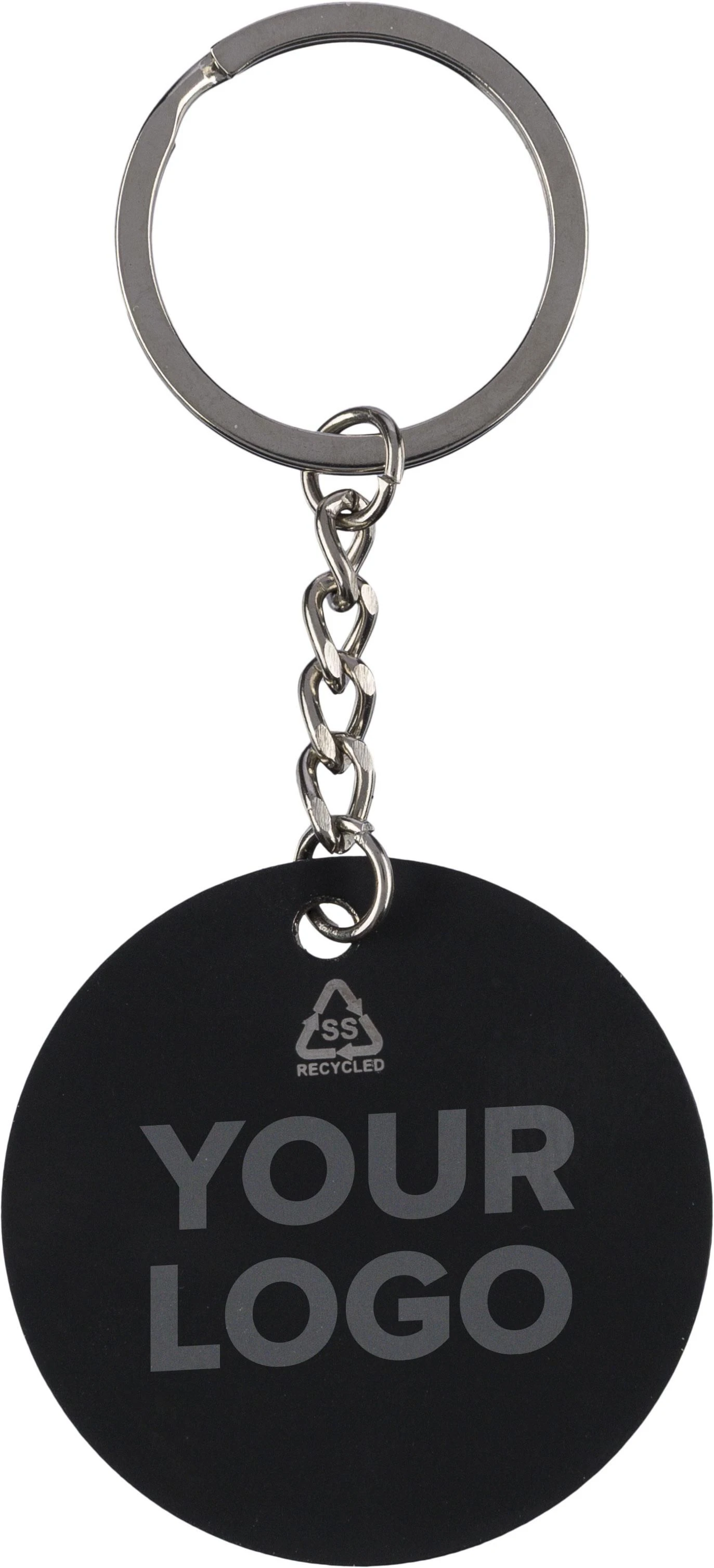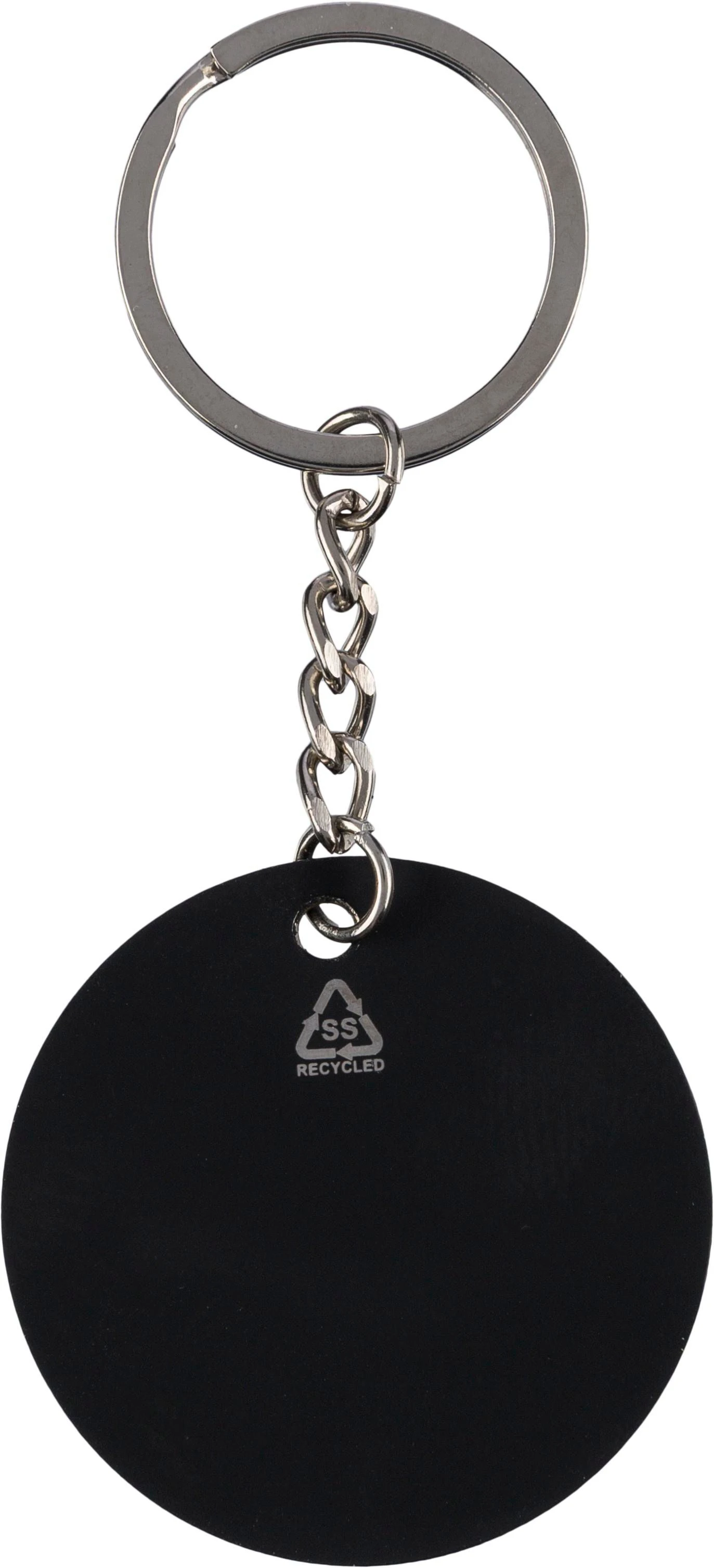 €1.21Reciklirani nehrđajući čelik gumirani privjesak za ključeve s metalnim prstenom u obliku nogometne lopte s ugraviranim logotipom recikliranja koji otkriva efekt ogledala nakon graviranja pojedinačno pakiran u kraft papirnatu omotnicu