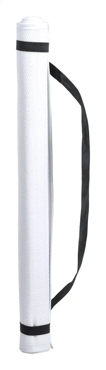 Plastična plažna prostirka s pletenim uzorkom, elastičnim zatvaračem i remenom za nošenje.