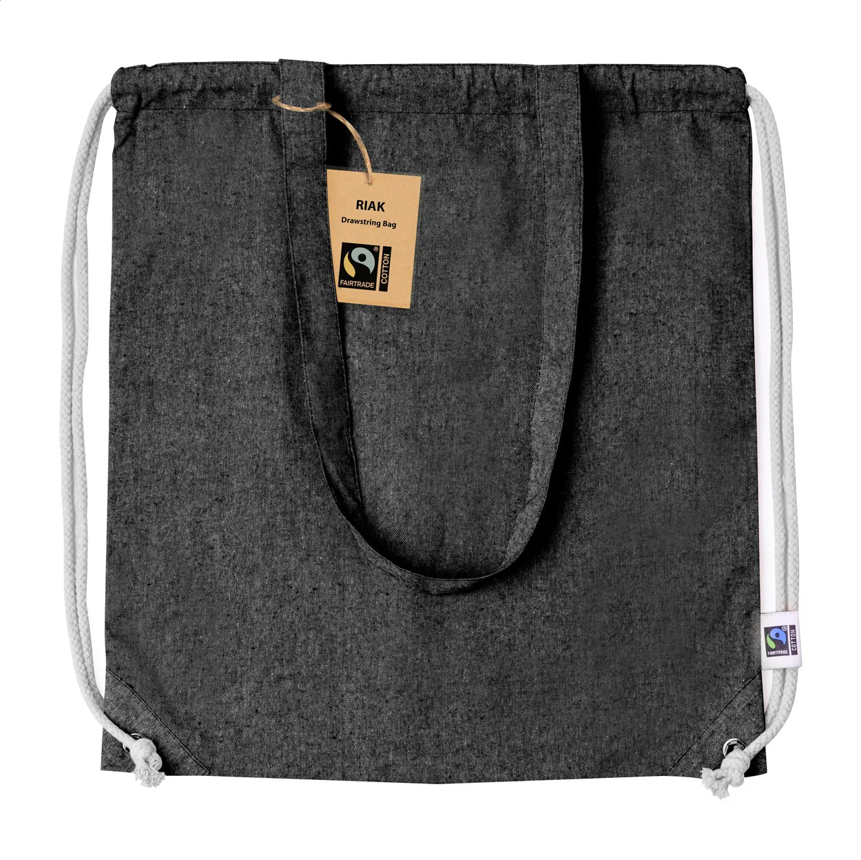 Fairtrade vrećica na vezicu od recikliranog pamuka s dugim ručkama, može se koristiti i kao torba za kupovinu, 100% Fairtrade pamuk, 140 g/m², s prepoznatljivom Fairtrade etiketom