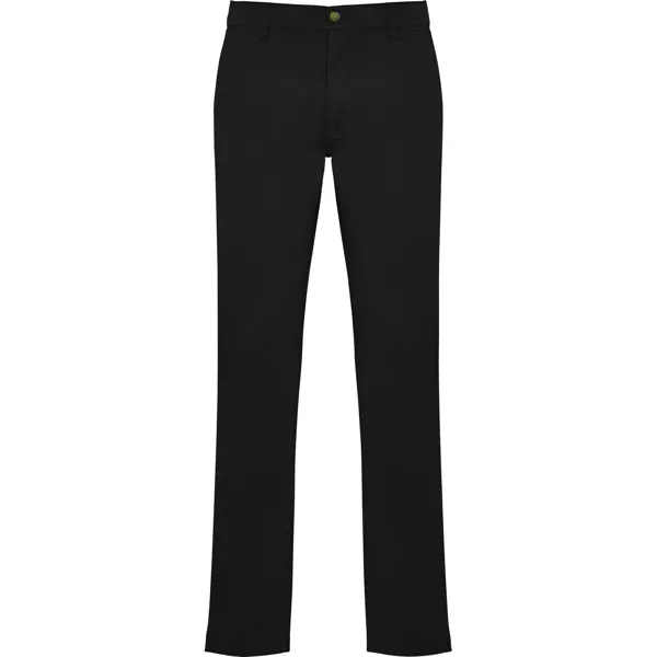Duge hlače od rastezljivog materijala s patentnim zatvaračem i gumbom, s pojasnim pasicama, prednjim džepovima na bokovima i dva stražnja paspulirana džepa s gumbom