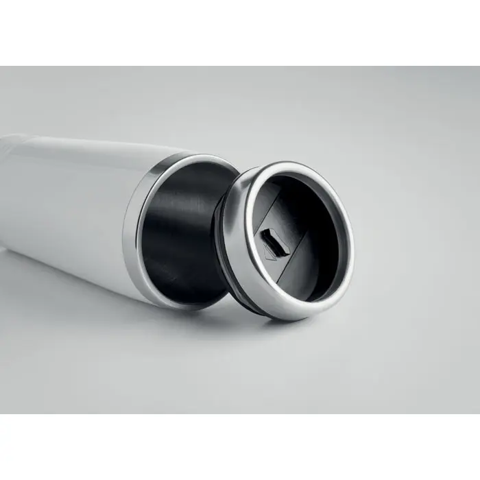 Putna čaša od nehrđajućeg čelika s dvostrukim zidom i crnim PP poklopcem. Kapacitet: 400 ml.