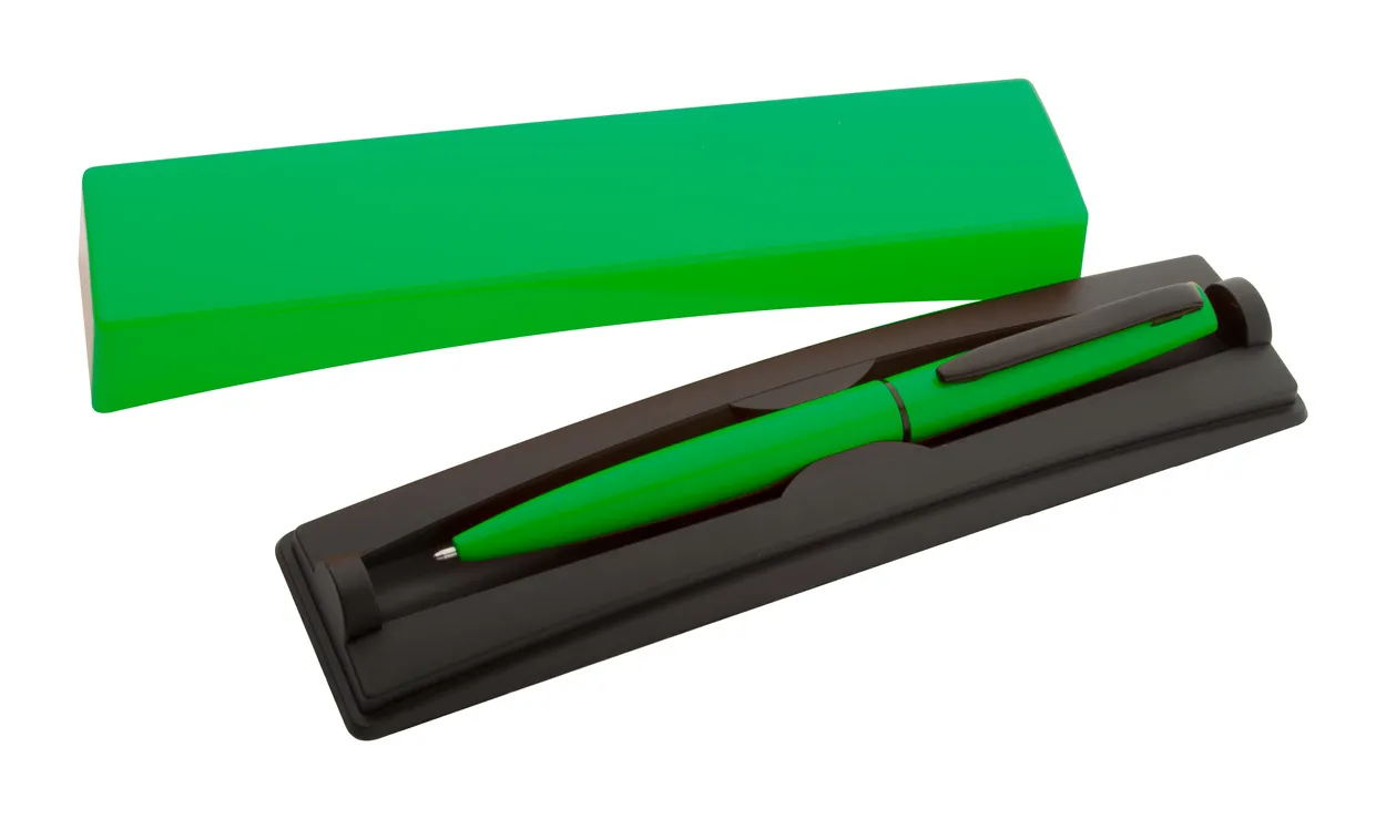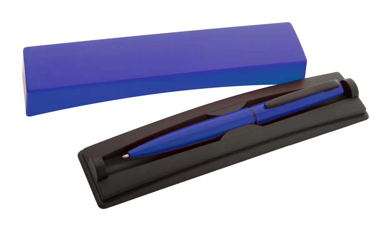 Aluminijska kemijska olovka u plastičnoj kutiji u odgovarajućoj boji. S plavim punjenjem.