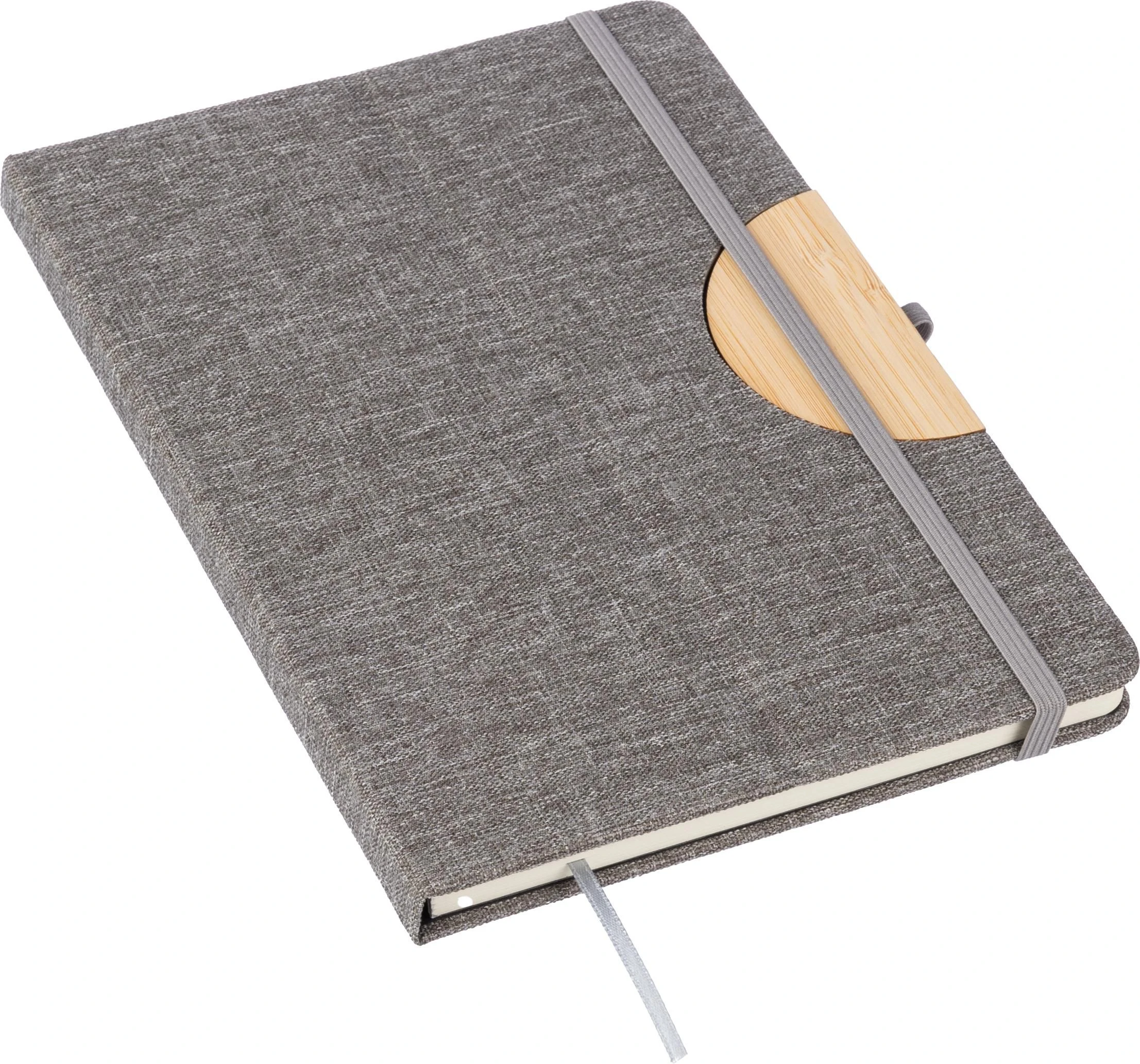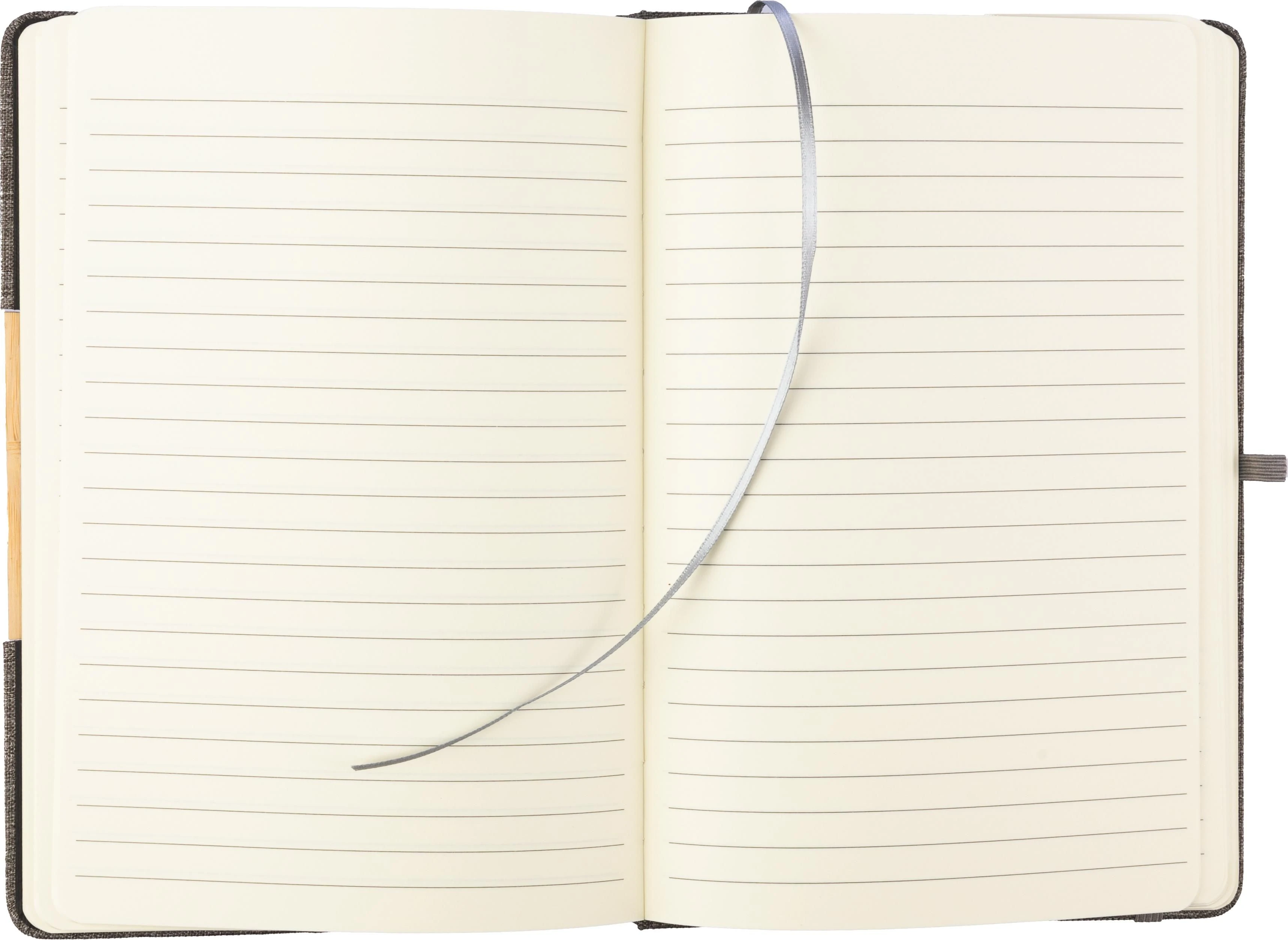 rPET (300D) bilježnica (približno A5) s 80 liniranih stranica (70 g/m²), preklopni omot pretvara se u držač za telefon, detalj od bambusa na omotu