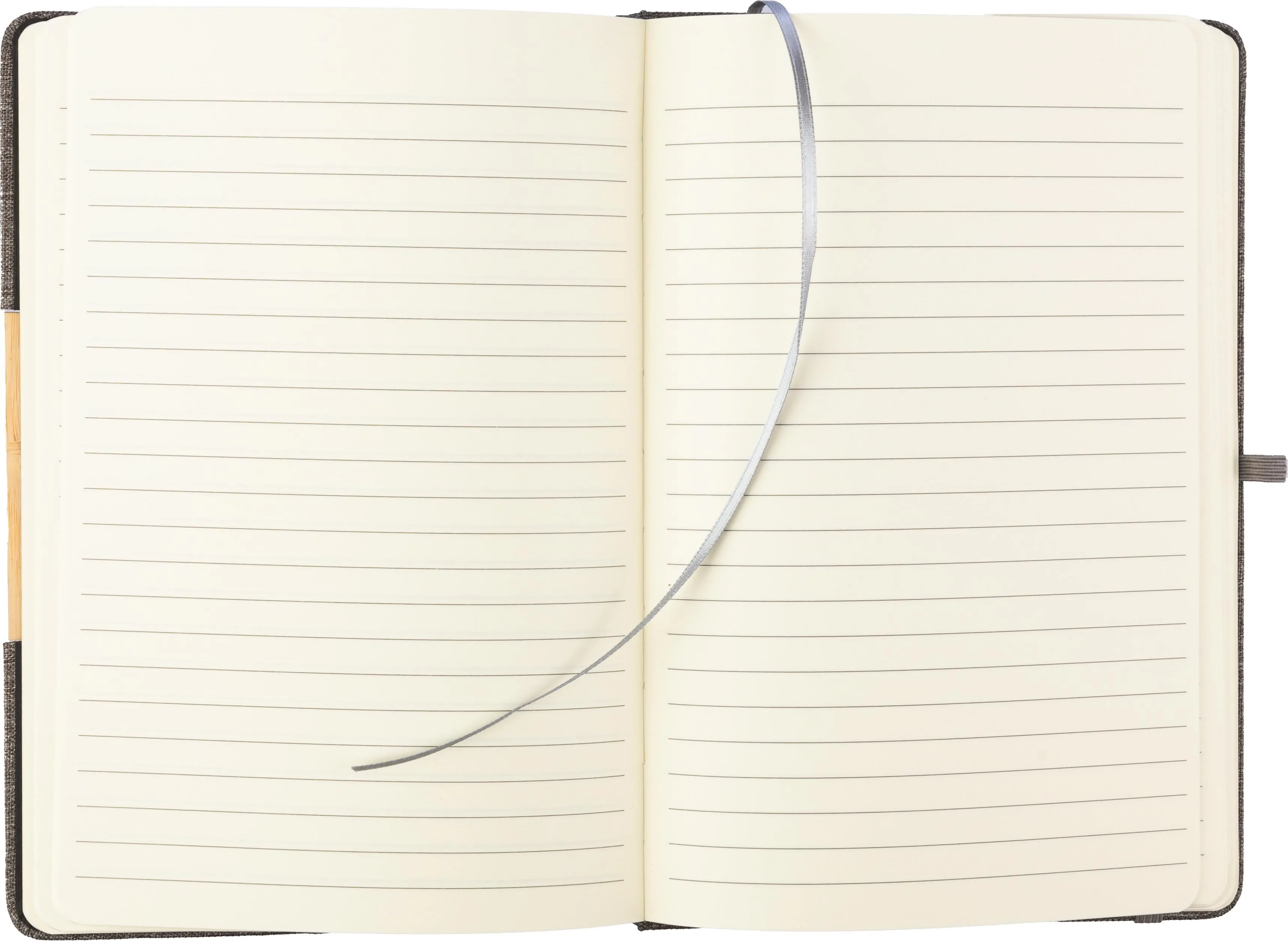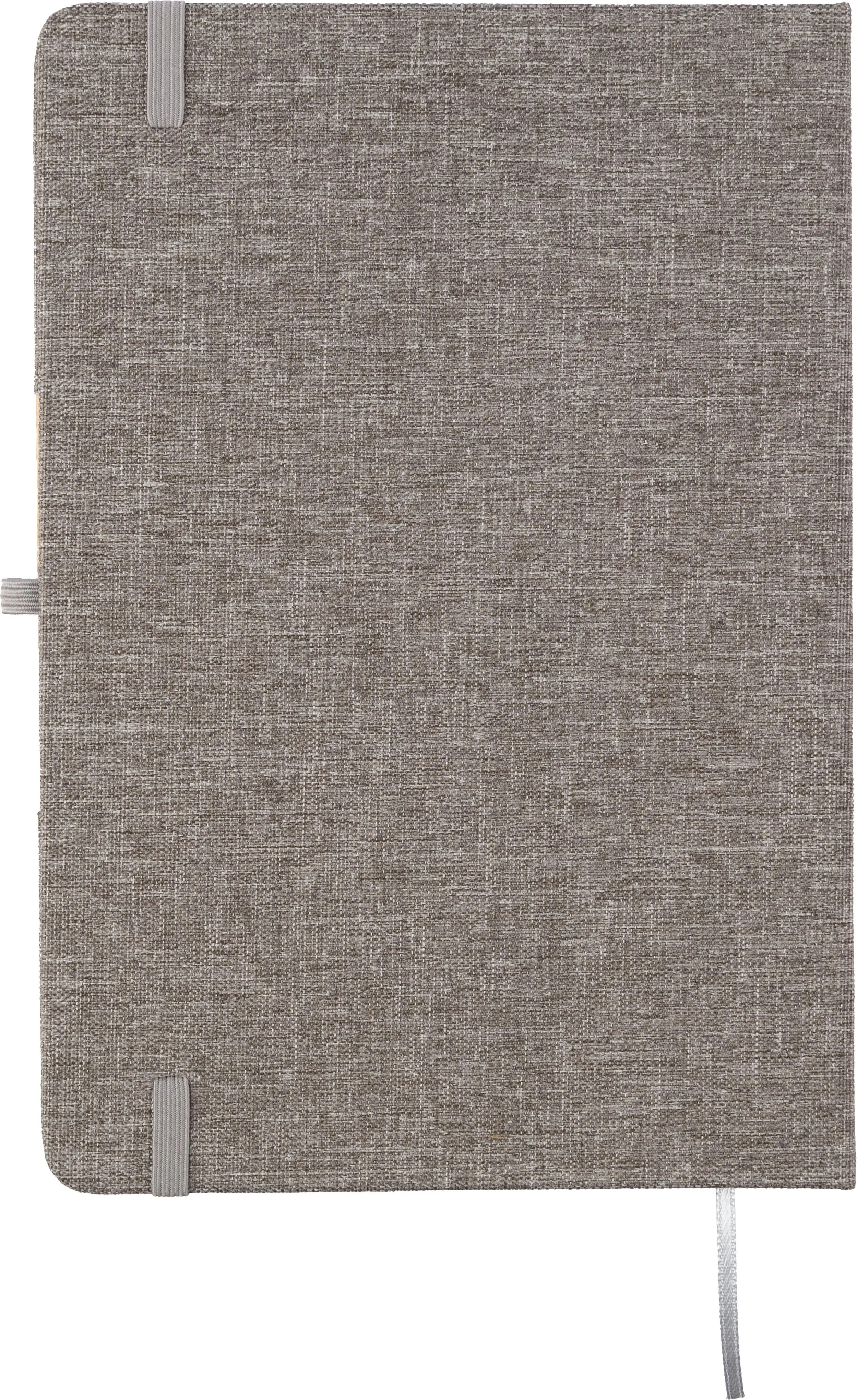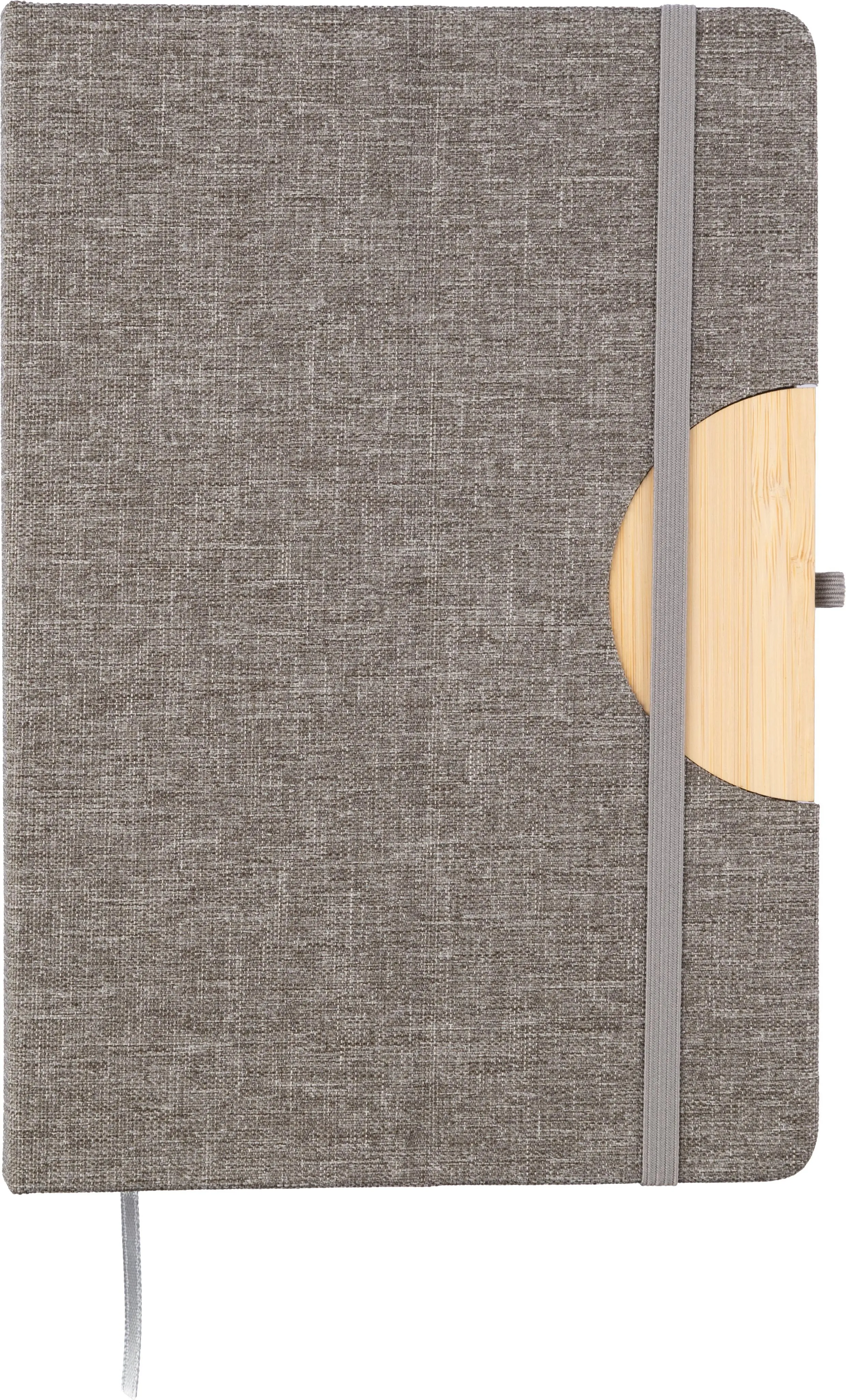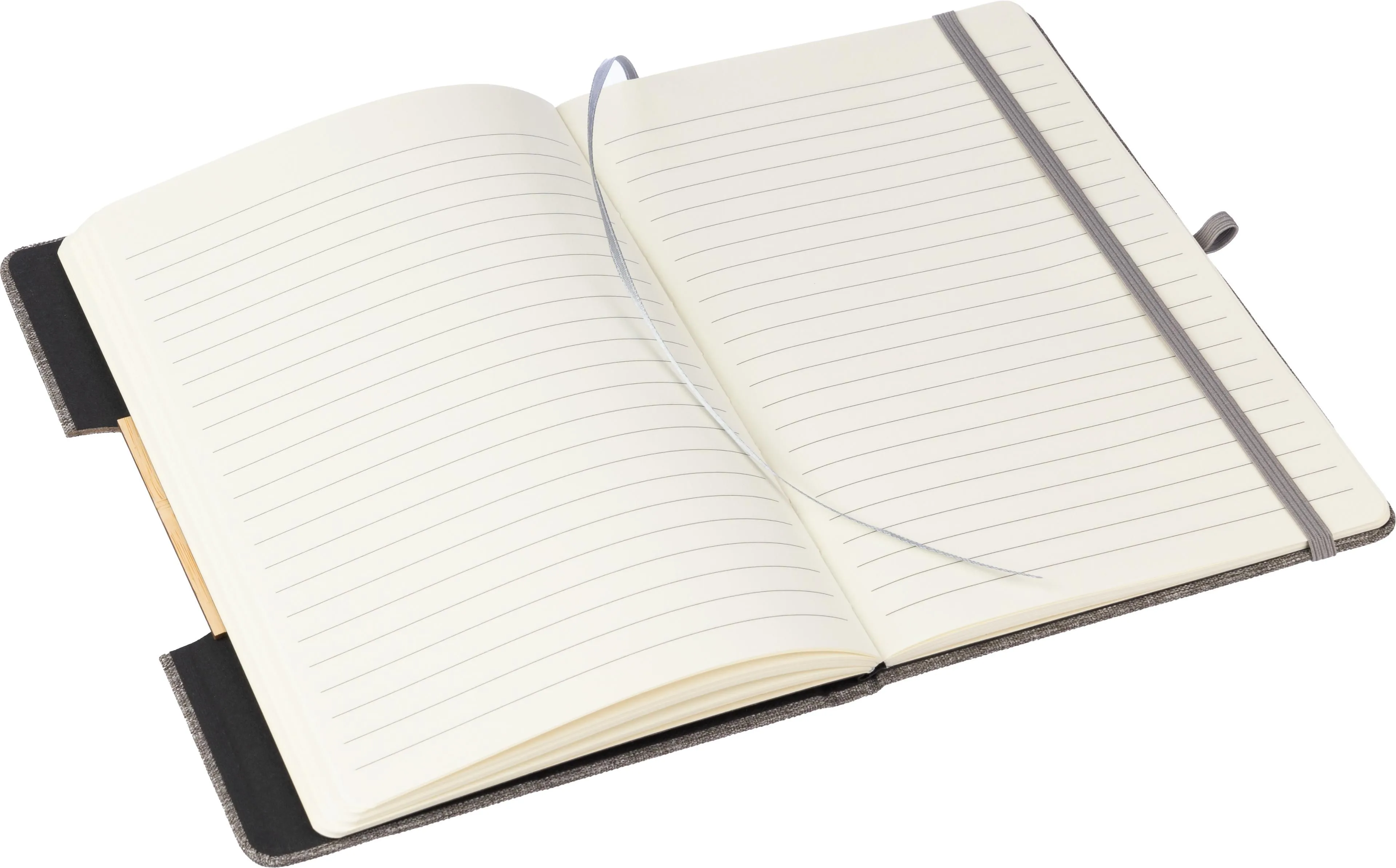 rPET (300D) notebook (approx. A5) with 80 lined pages (70 gsm). The paper in this notebook is FSC® Mix certified. Foldable cover turns into phone holder, featuring bamboo detail on the cover.