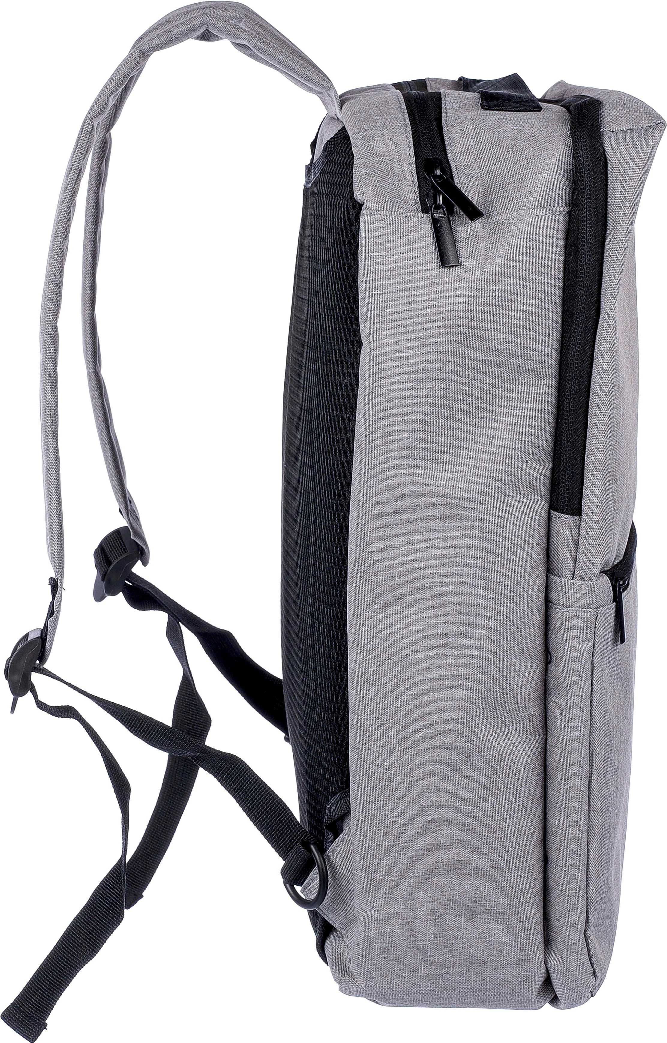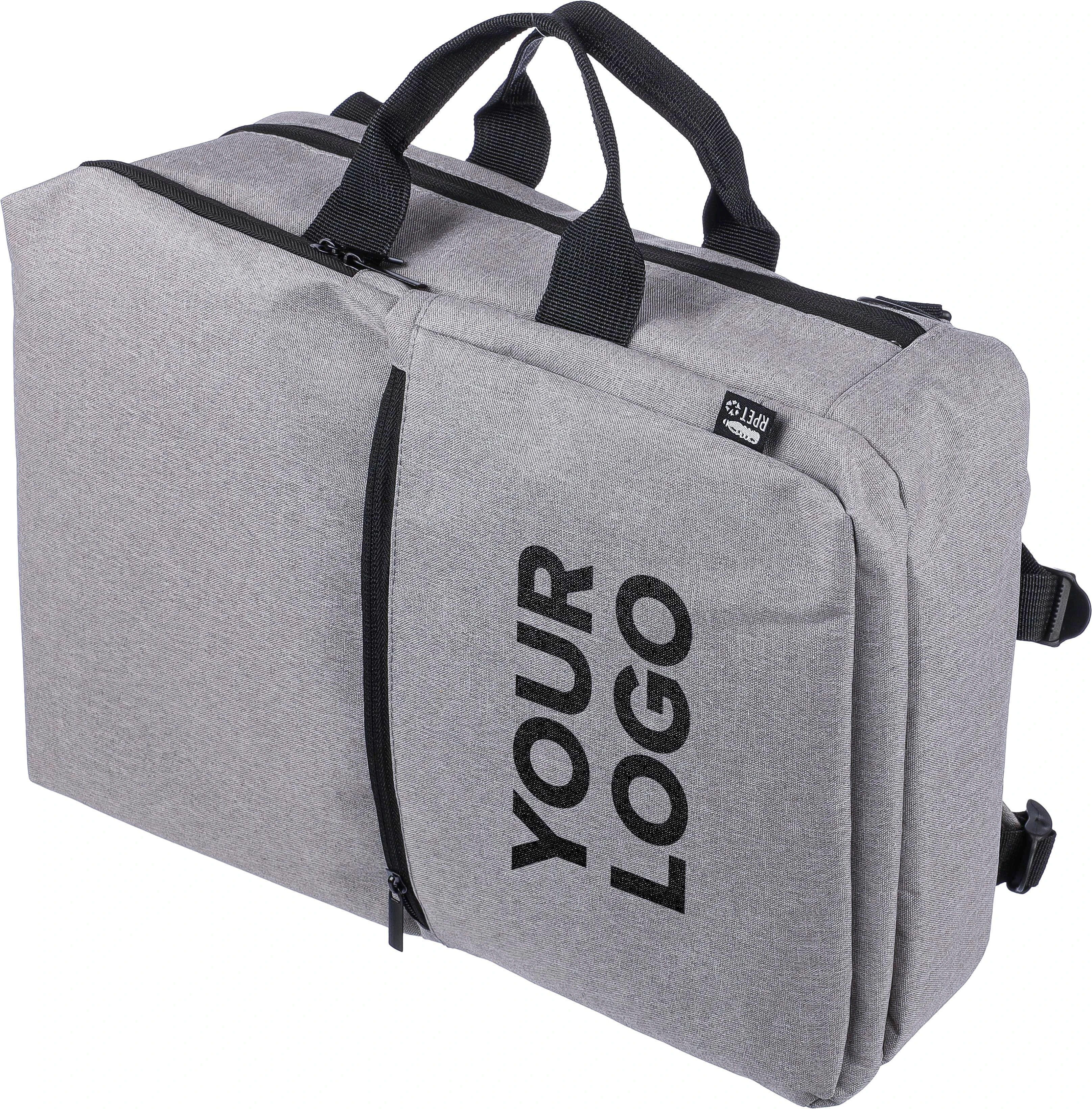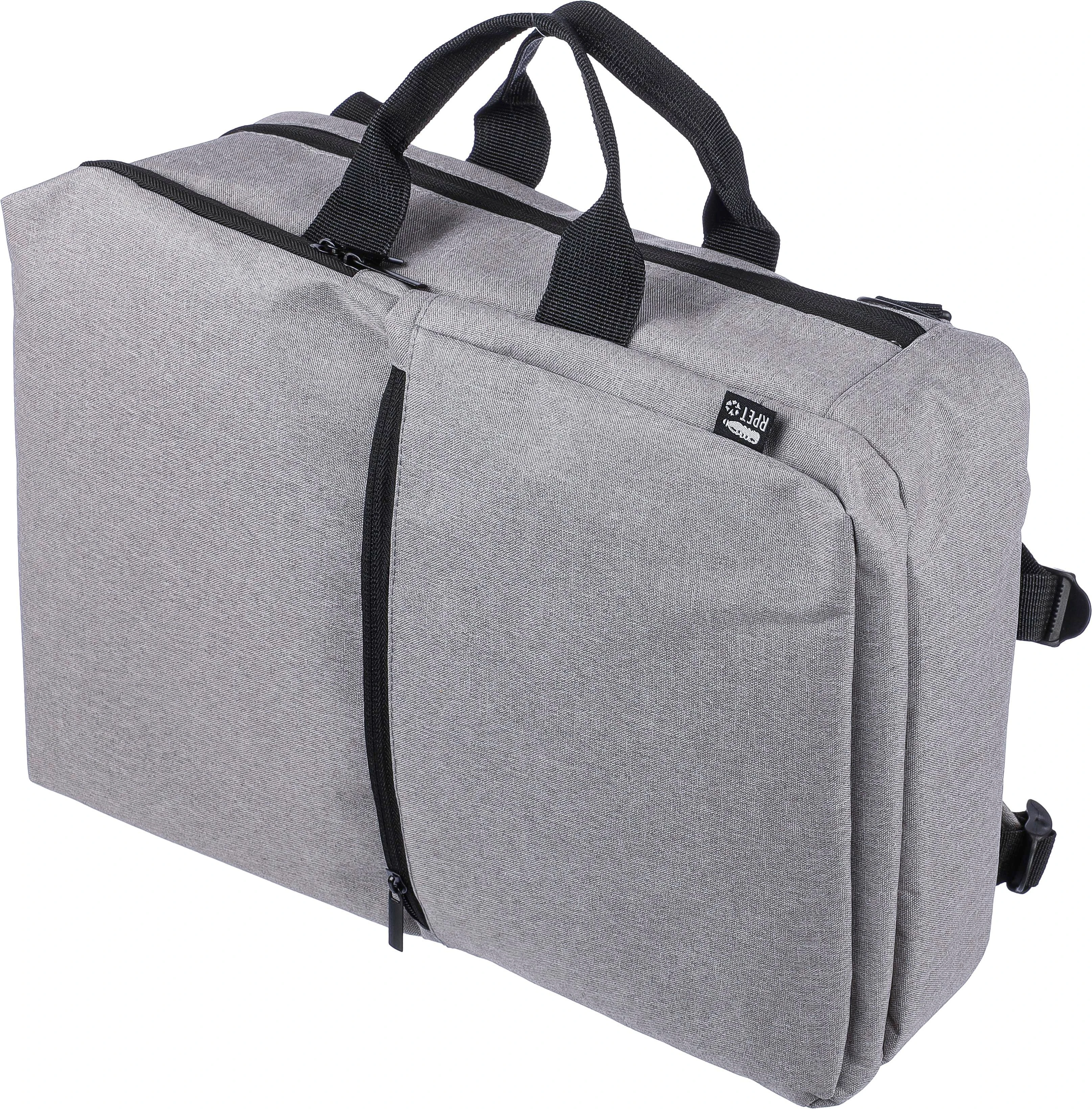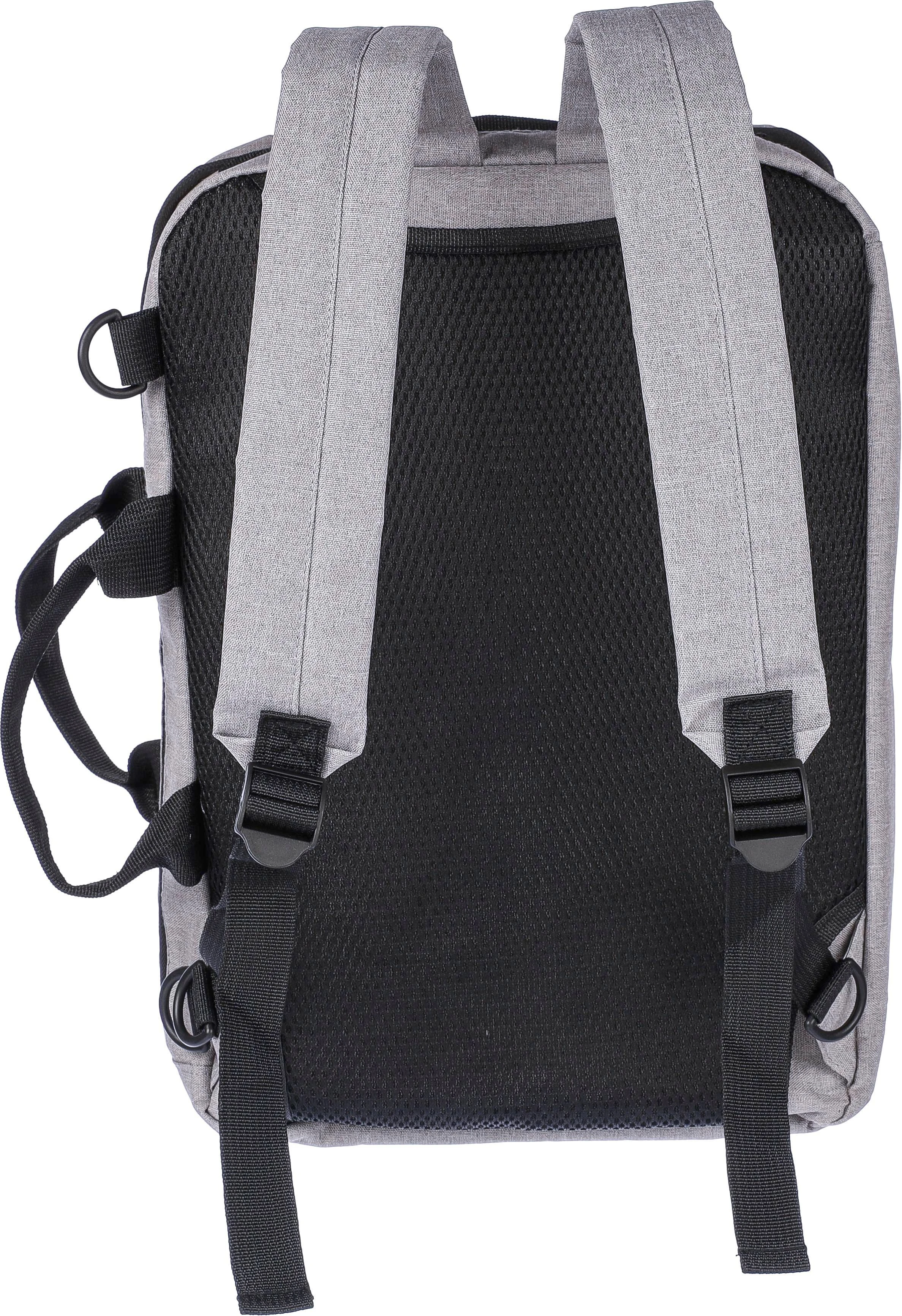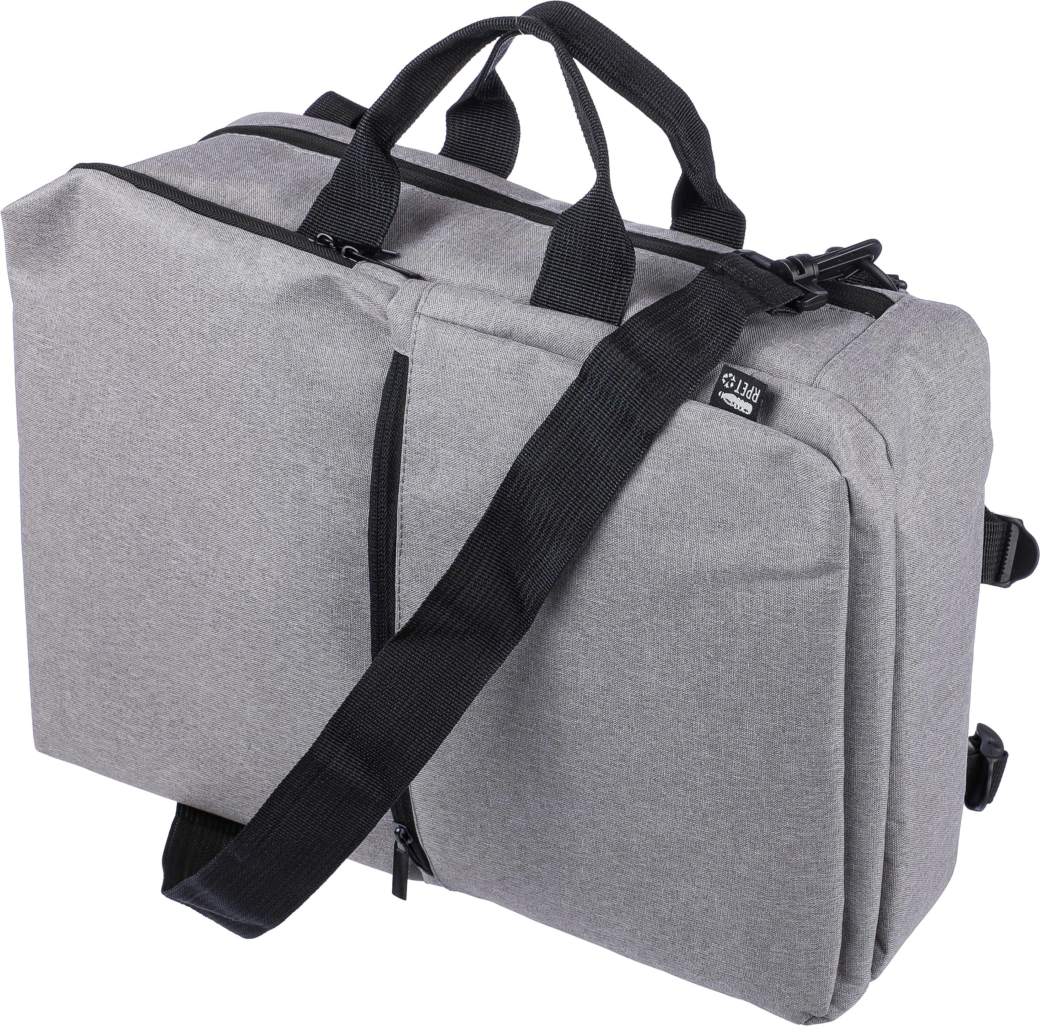 €11.80Ruksak i torba za prijenosno računalo (15 inča) od rPET poliestera (300D) s unutarnjom podstavom od 210D. Prikladno za kabinu. S petljom za nošenje na vrhu, podesivim naramenicama i dvije ručke za nošenje sa strane. Podesive trake se skrivaju iza podstave za funkciju nošenja sa bočnim ručkama. Odjeljak za prijenosno računalo na čičak i mali odjeljak na patentni zatvarač. S prozračnom podstavljenom stražnjom stranom. Nosivost otprilike 8 kg. Uključuje rPET etiketu.