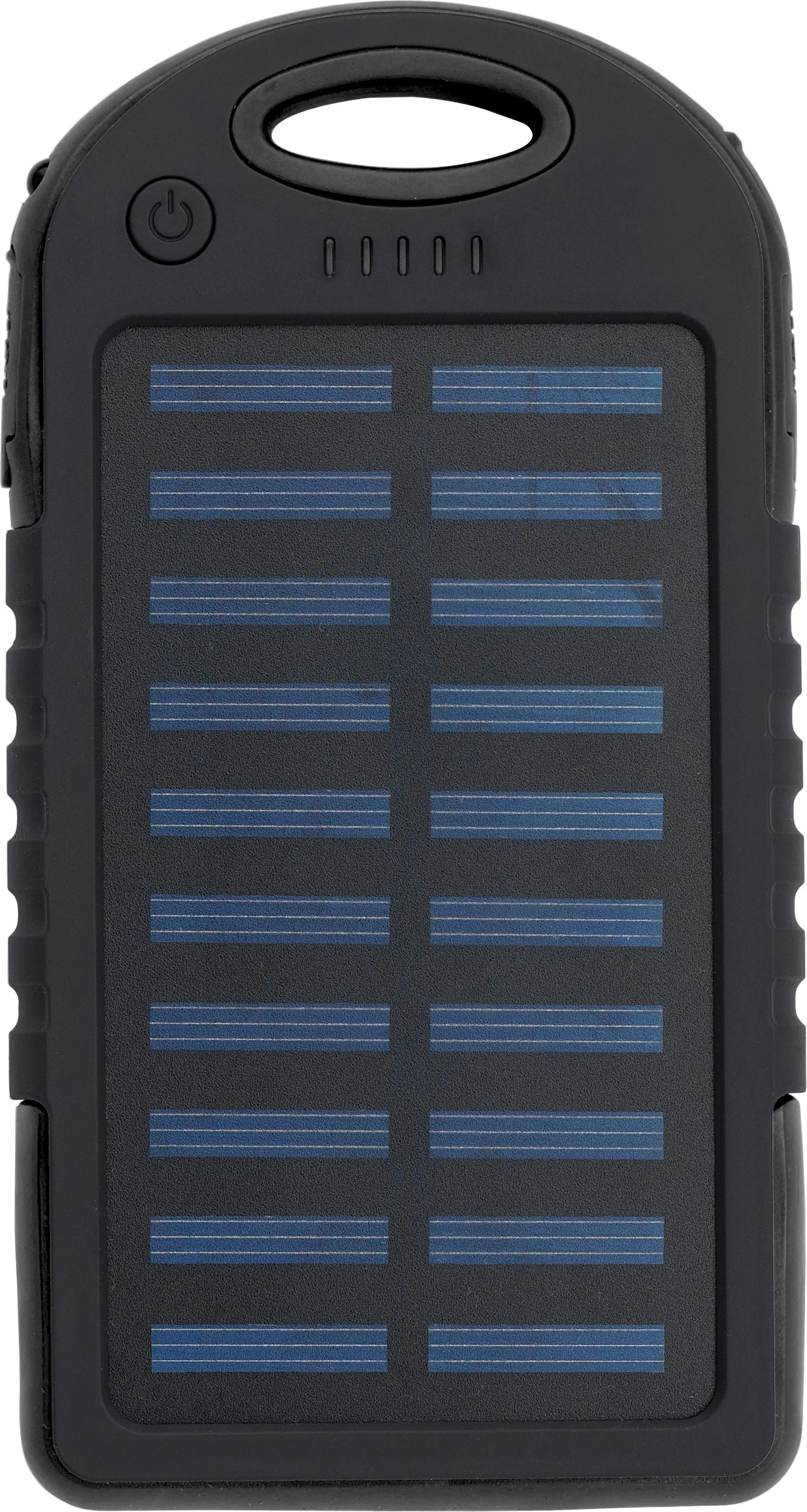 €11.13Gumeni ABS solarni power bank s zelenim indikatorskim svjetlima i bočnom svjetiljkom. Dva USB priključka i jedan USB-C priključak. Solarno punjenje 5V/200mA. Ulaz DC 5V/1A. Izlaz DC 5V/2x1A. Kapacitet: 4,000mAh. Uključuje USB kabel.