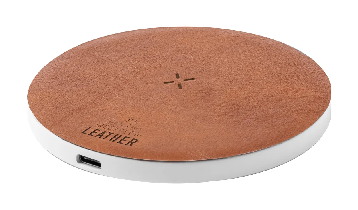 Bežični brzi punjač (15W) u kućištu od recikliranog ABS-a prekrivenog recikliranom kožom. Uključuje USB kabel za punjenje.