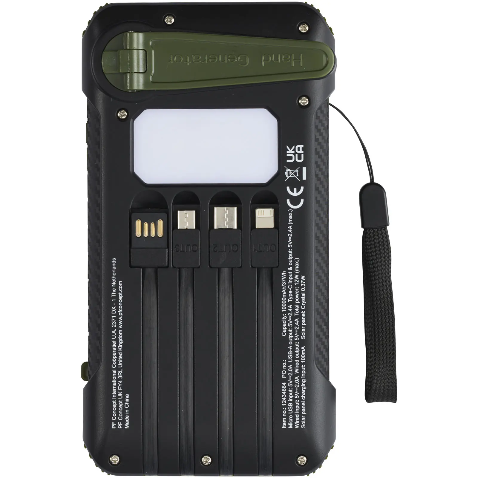 €27.16RCS reciklirana plastična solarna powerbank baterija kapaciteta 10.000 mAh s ručnim dinamo mehanizmom za ručno generiranje energije i mogućnošću punjenja putem Type-C ili micro USB priključka, ugrađeni kabeli s Type-C, iOS, USB-A i micro USB priključcima omogućuju punjenje većine pametnih telefona, kamera, powerbankova, slušalica i dr., maksimalna izlazna snaga 2,4A po priključku, ulazna snaga ograničena na 2A, isporučuje se s uputama, USB-A na Type-C kabelom duljine 30 cm i pakirana u 100% recikliranu kraft papirnatu kutiju