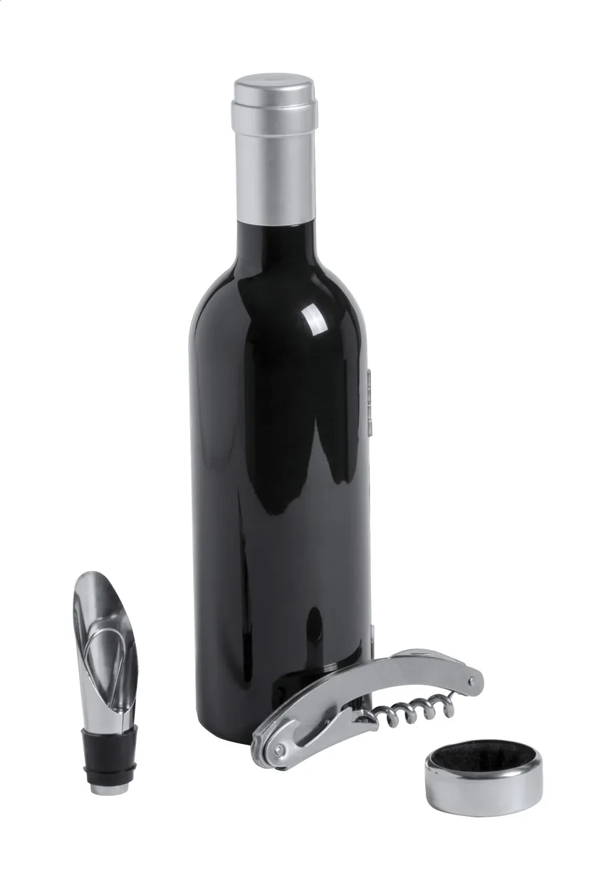 Set za vino u obliku boce s vadičepom, prstenom za zaštitu od kapljanja i nastavkom.