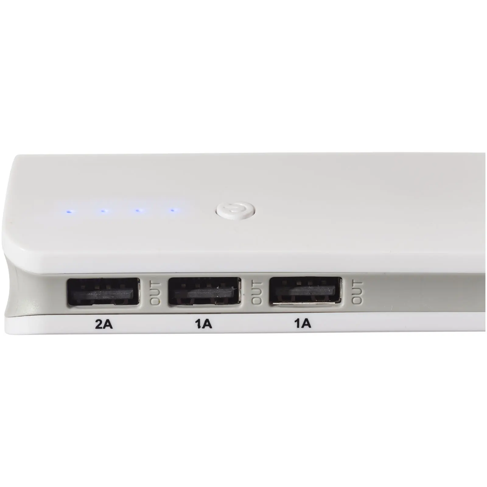 €16.56Powerbank s 10000 mAh Grade A litij-ionskom baterijom i svjetiljkom za korištenje u mraku, mogućnost punjenja do tri uređaja istovremeno (maksimalni izlaz 5V/2,1A; izlaz 1: 5V/1A, izlaz 2: 5V/1A, izlaz 3: 5V/2,1A), 4 plava LED indikatora prikazuju preostali kapacitet baterije, uključuje USB na Micro USB kabel za punjenje, isporučuje se u bijelom Avenue gift boxu
