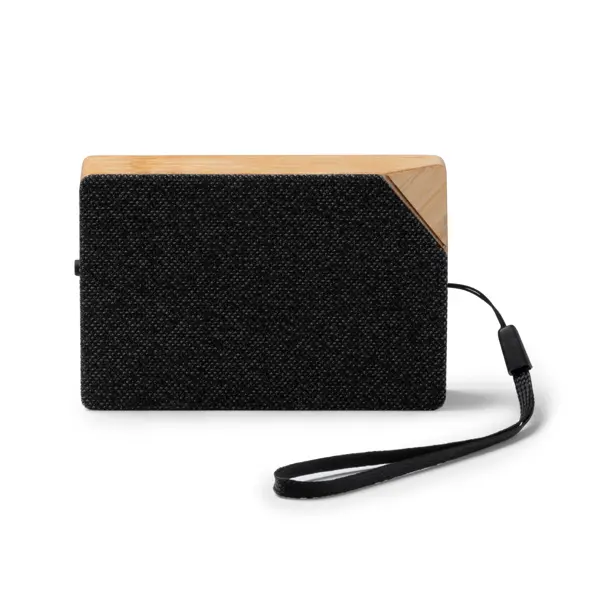 Bežični solarni zvučnik od bambusa s površinom od recikliranog RPET poliestera. Snaga 3W s udobnom ručkom za nošenje. Tip C. Kabel uključen. Prezentiran u kutiji eko dizajna.