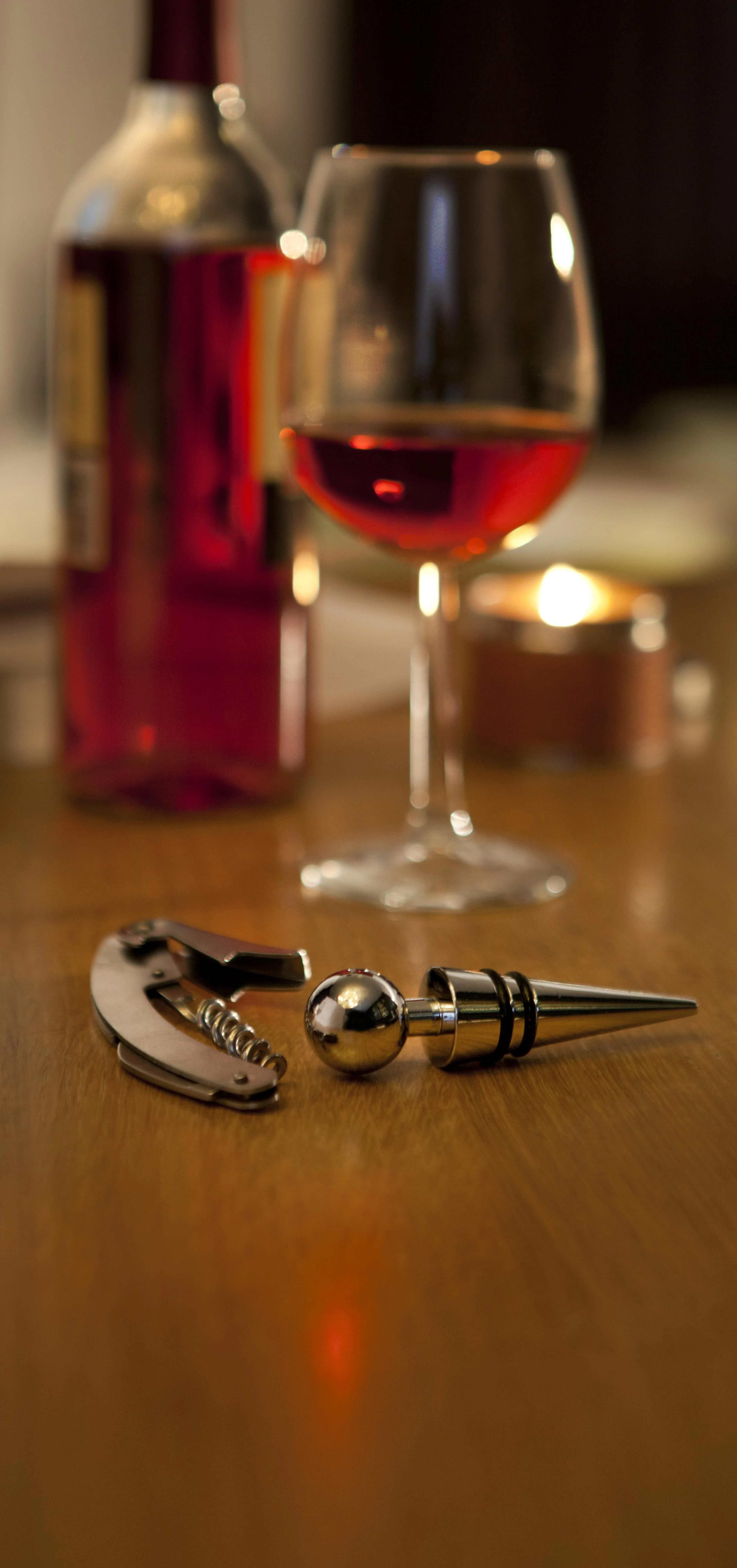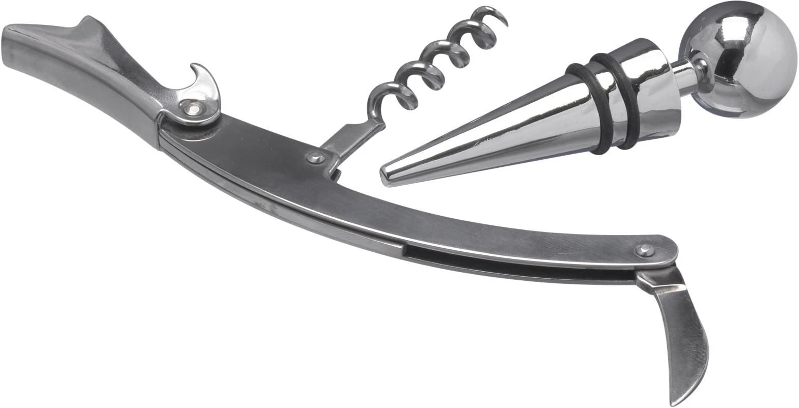 Set za vino od nehrđajućeg čelika, s metalnim konobarskim nožem i čepom za bocu. Pakirano u crnu poklon kutiju.