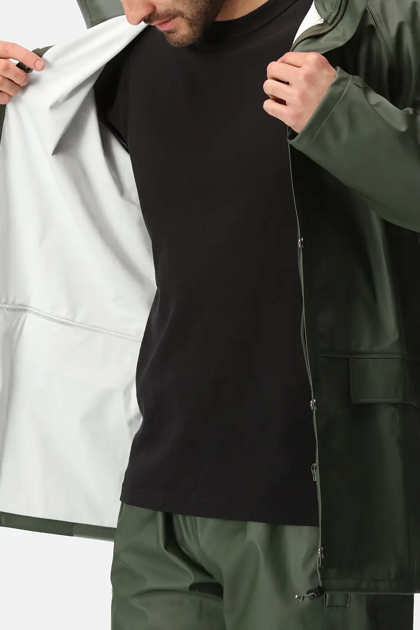 Informacije o tkanini: vodootporna i vjetrootporna tkanina s PU premazom, udobna i lagana podstava od trikotaže, visoka prozračnost, vrlo mekana i izdržljiva; posebne značajke: vareni šavovi, preklop s drukerima, kapuljača na sklapanje s podešavanjem, 2 donja džepa, podesive manšete, podesiv donji rub s elastičnom vezicom, bez vanjskog logotipa