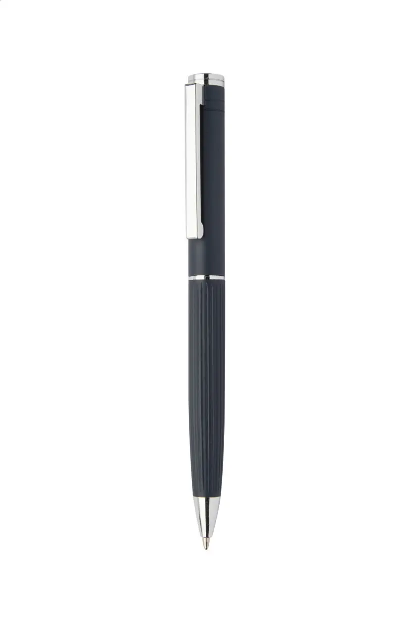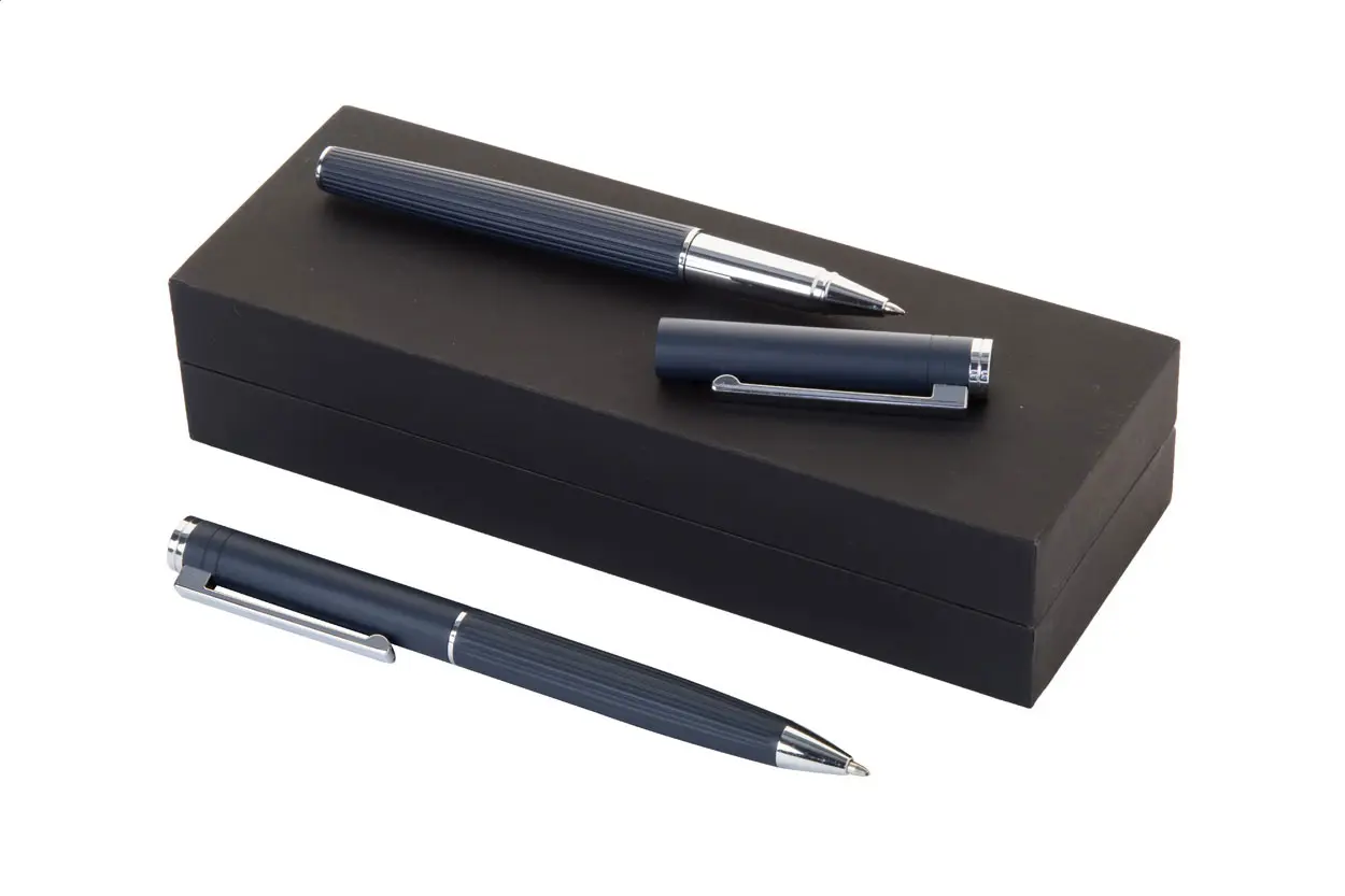 €18.32Set elegantne kemijske olovke i roler olovke od aluminija s prugastom teksturom na cilindru. Dolazi u crnoj poklon kutiji, s plavim punjenjem.