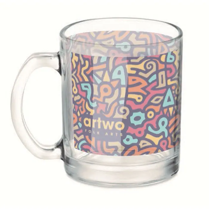 €2.27Staklena šalica sjajne površine zapremnine 300 ml s posebnom presvlakom za sublimacijski tisak