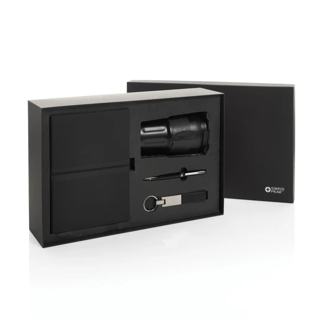 €56.61Poklon set sadrži dvoslojni termo čašu od 350 ml s vakuum izolacijom i nepropusnim poklopcem Swiss Peak privjesak za ključeve s metalnim sjajem i PU remenom kemijsku olovku s kapacitetom pisanja 1000 metara i bilježnicu od recikliranog poliestera s 160 stranica od recikliranog papira svi proizvodi u setu imaju RCS certifikat i sadrže ukupno 75% recikliranog materijala isporučuje se u gift boxu