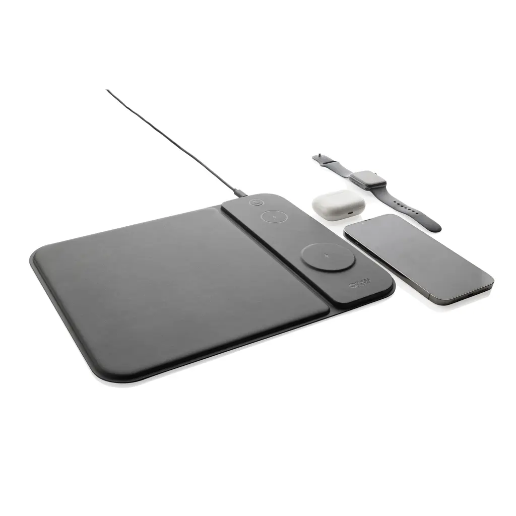 3-u-1 bežični punjač i podloga za miš izrađeni od RCS recikliranog PU-a, ukupni udio recikliranog materijala 5% prema masi proizvoda, RCS certifikat, magnetski 15W bežični punjač, dodatni 5W bežični punjač za slušalice ili druge male uređaje, 2,5W bežični punjač za pametne satove (samo Apple Watch), uključuje RCS certificirani TPE kabel duljine 120 cm, pakirano u FSC® mix ambalaži, bez PVC-a, ulaz 9V/3A, izlaz: telefon 9V/1,1A ili 9V/1,67A (15W), slušalice 5V/1A (5W), sat 5V/0,5A