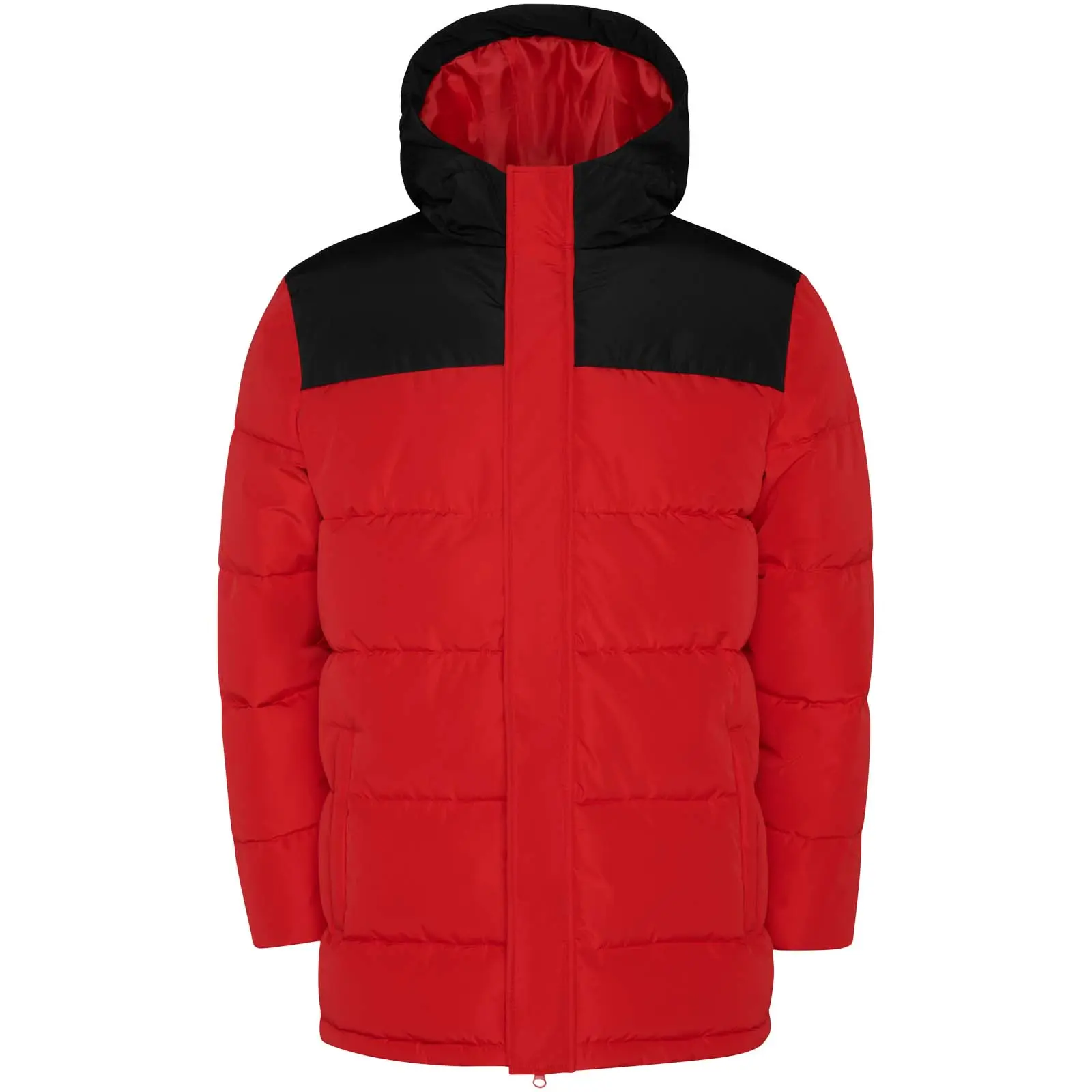 Padded jacket with fixed hood. Front zipper covered with a placket. Chin guard. Two side pockets with zip. Elastic cuffs.