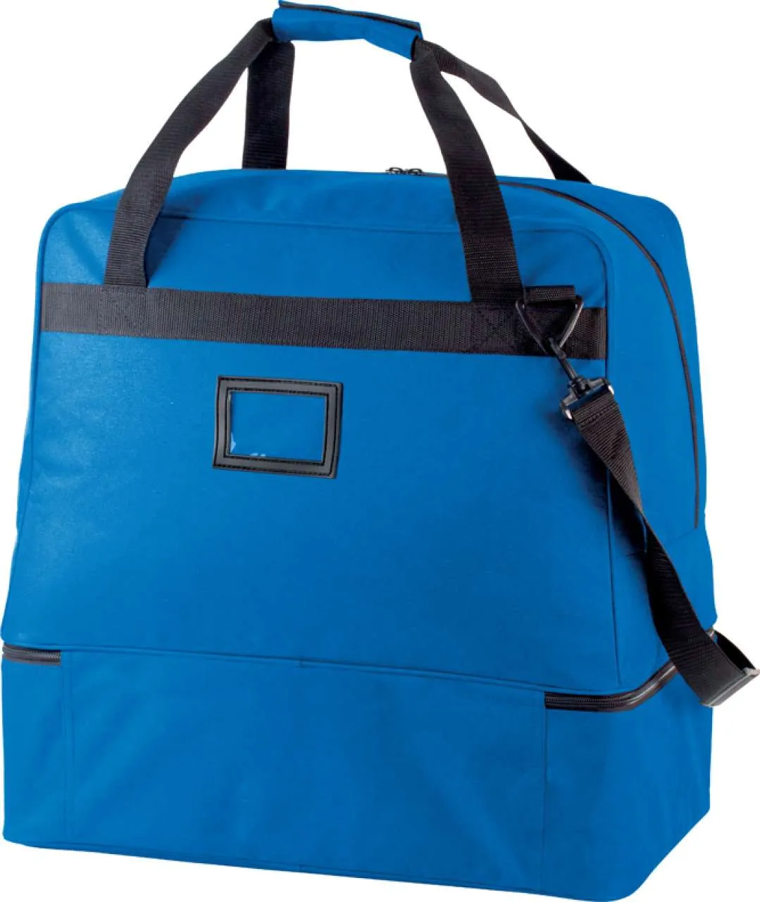 Sportska torba za timove od 600D poliestera 60 litara Odvojivi čvrsti dno od polipropilena s plastičnim nogicama Prednji džep na patentni zatvarač idealan za personalizaciju Držač za kartice, odvojiva naramenica s silikonskim jastučićem za rame Čvrsto dno dolazi s torbom